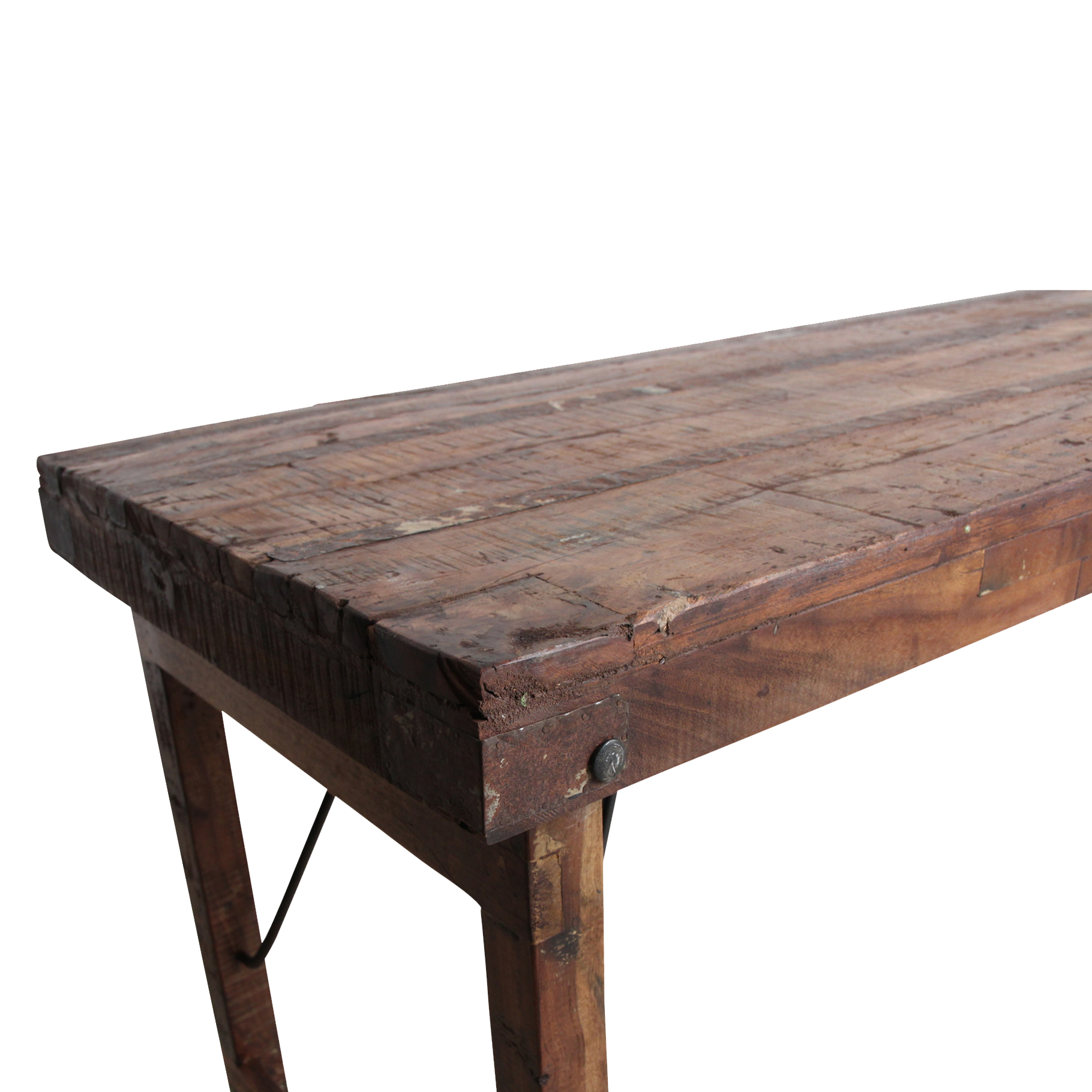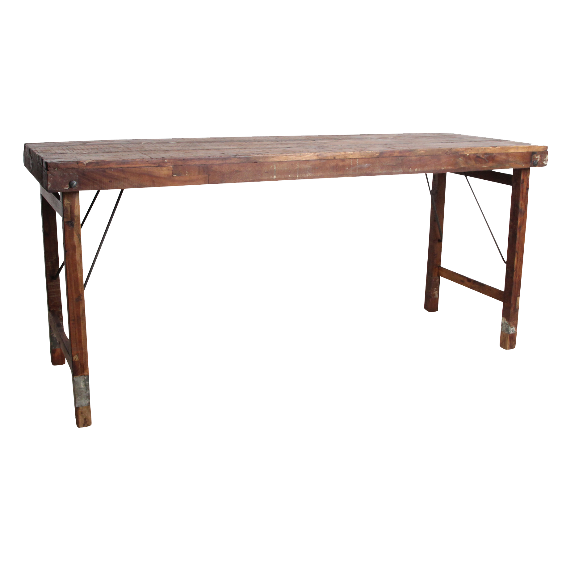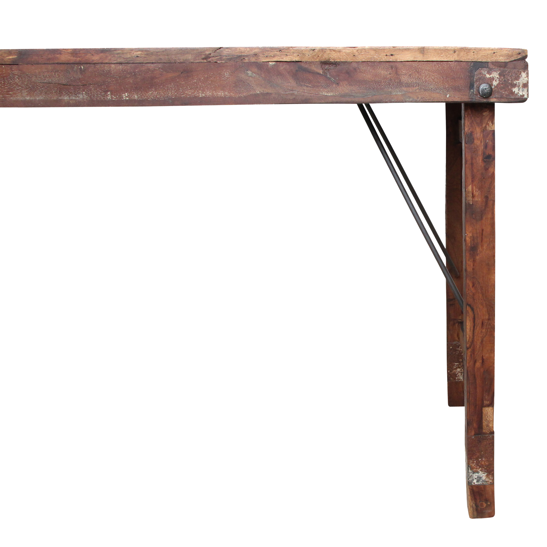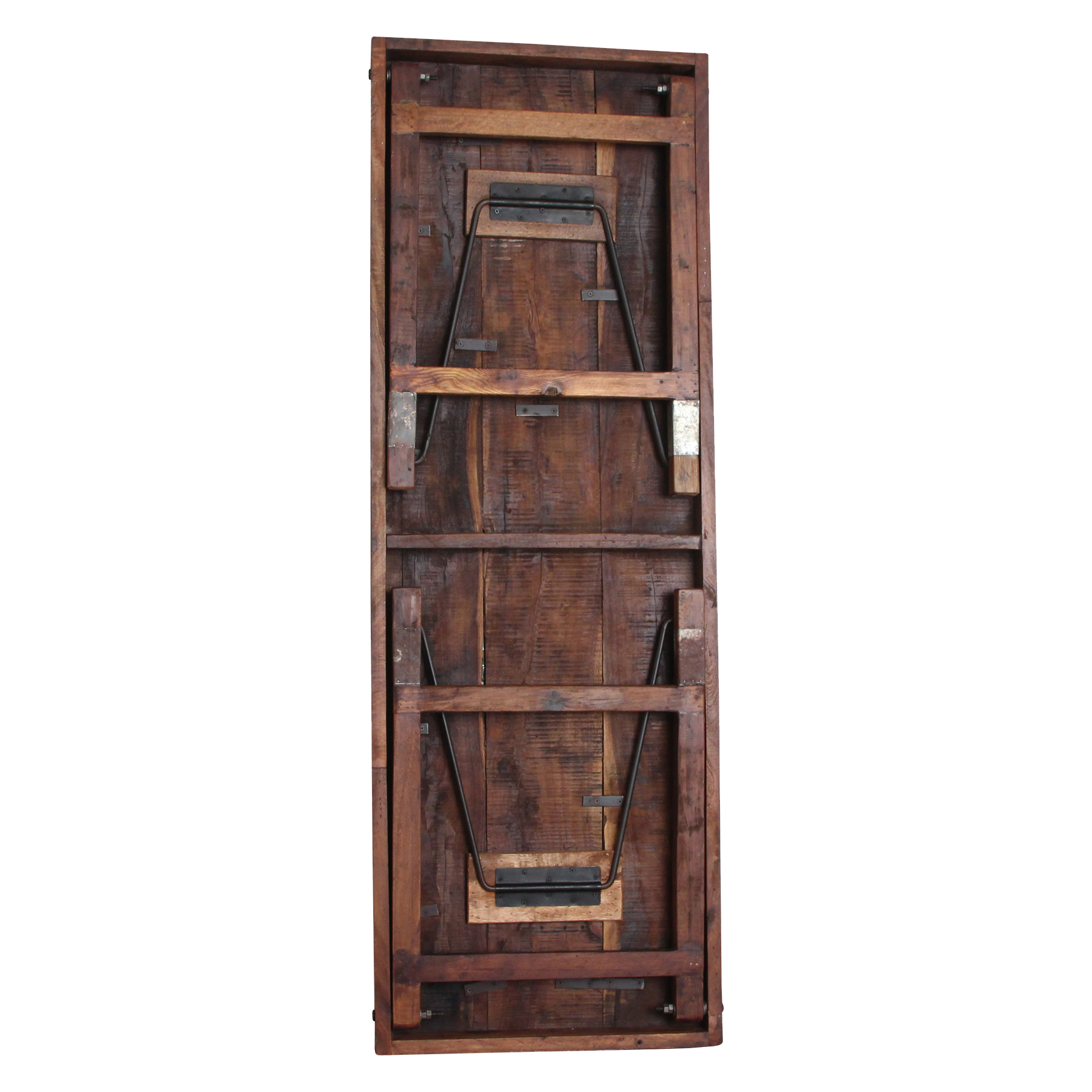Deze unieke opvouwbare eettafel is gemaakt van gerecycled hardhout met een natuurlijke, verweerde uitstraling. Ooit werden dit soort klaptafels gebruikt bij Indiase bruiloften, festivals en openbare evenementen. Ze werden per vrachtwagen aangevoerd, naast elkaar uitgeklapt en na afloop weer naar een nieuwe locatie verplaatst. Iedere tafel draagt daardoor een eigen verhaal, met markeringen en krassen die de leeftijd en gebruiksgeschiedenis weerspiegelen. Volledig opgeknapt en duurzaam In onze fabriek in India worden alle tafels zorgvuldig gerestaureerd. Beschadigde planken vervangen we door hout van andere tafels, spijkers verwijderen we uit het hout, en versleten poten worden vervangen door stevige gerecyclede houten poten. Zo krijgt iedere tafel zijn originele charme terug, zonder concessies te doen aan stevigheid en bruikbaarheid.