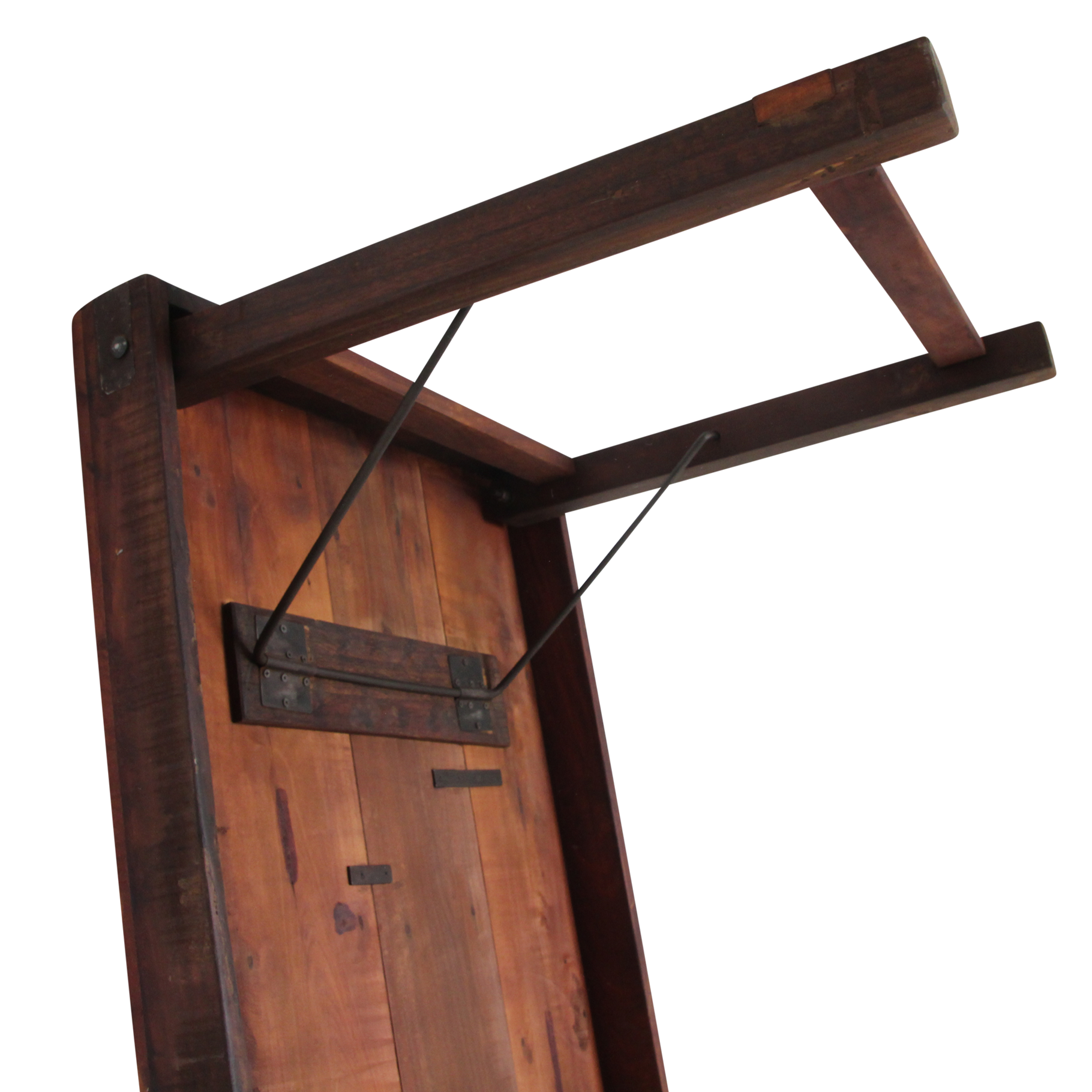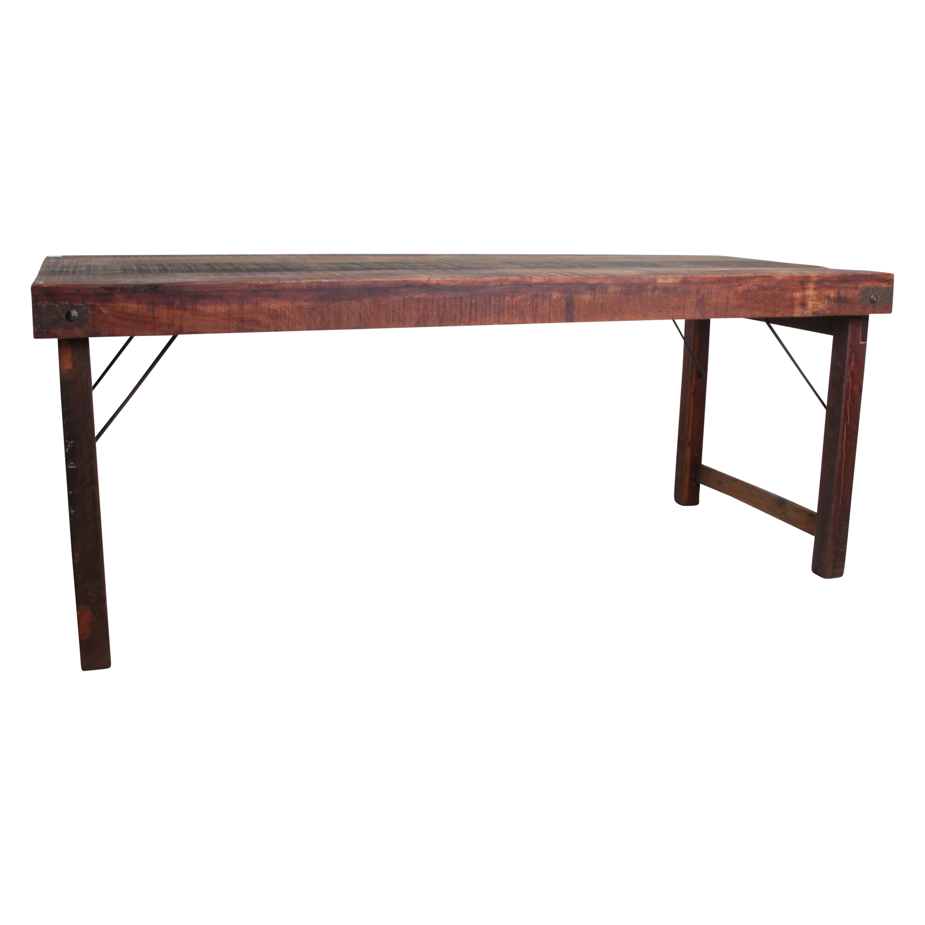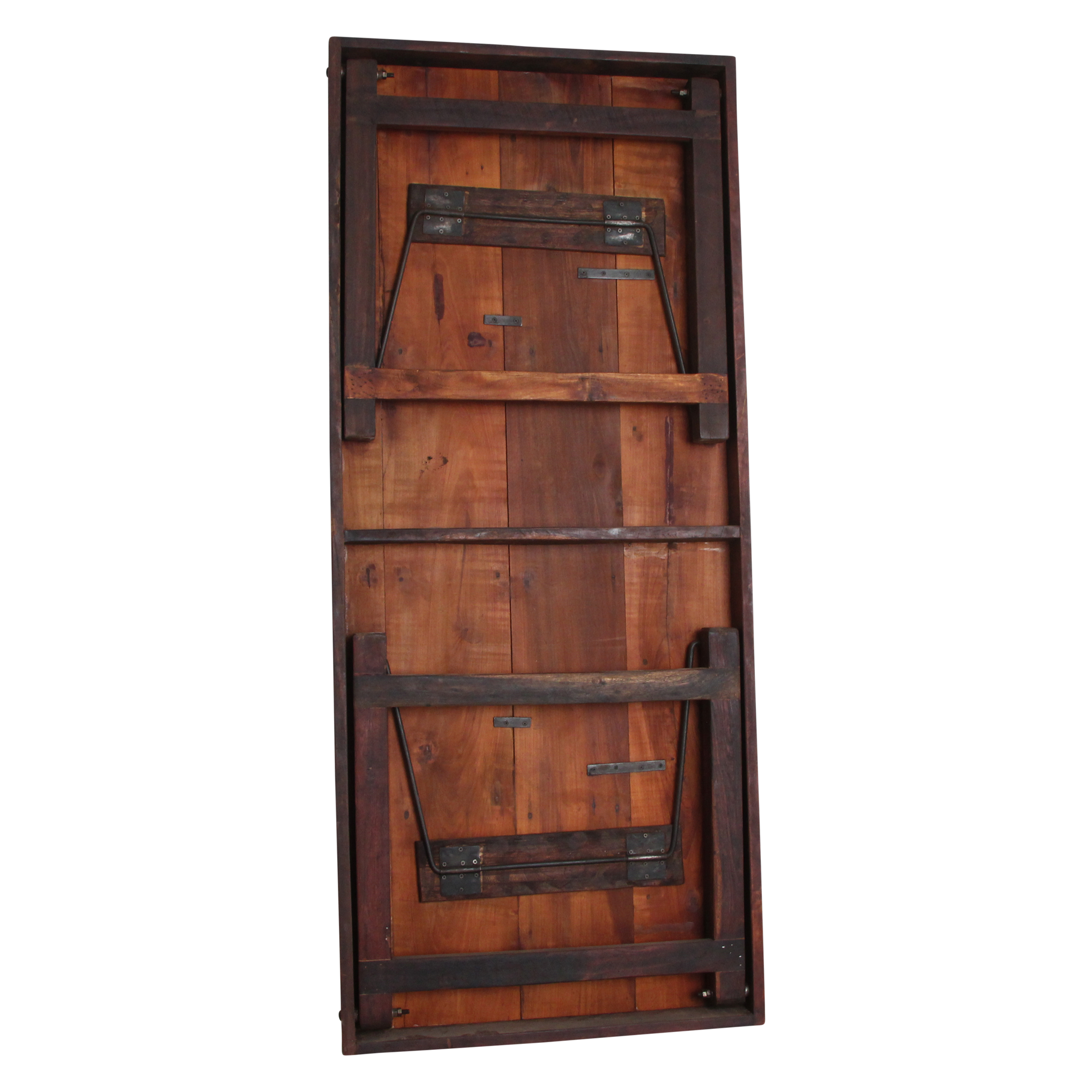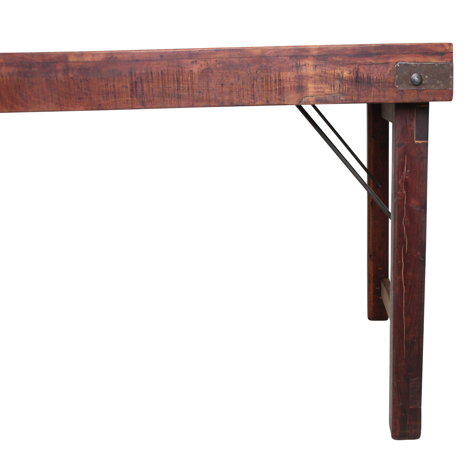 Deze unieke opvouwbare eettafel is gemaakt van gerecycled hardhout met een natuurlijke, verweerde uitstraling. Ooit werden dit soort klaptafels gebruikt bij Indiase bruiloften, festivals en openbare evenementen. Ze werden per vrachtwagen aangevoerd, naast elkaar uitgeklapt en na afloop weer naar een nieuwe locatie verplaatst. Iedere tafel draagt daardoor een eigen verhaal, met markeringen en krassen die de leeftijd en gebruiksgeschiedenis weerspiegelen. Volledig opgeknapt en duurzaam In onze fabriek in India worden alle tafels zorgvuldig gerestaureerd. Beschadigde planken vervangen we door hout van andere tafels, spijkers verwijderen we uit het hout, en versleten poten worden vervangen door stevige gerecyclede houten poten en een stabiel metalen onderstel. Zo krijgt iedere tafel zijn originele charme terug, zonder concessies te doen aan stevigheid en bruikbaarheid.