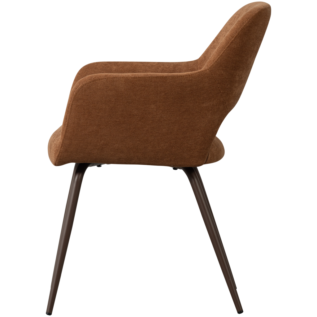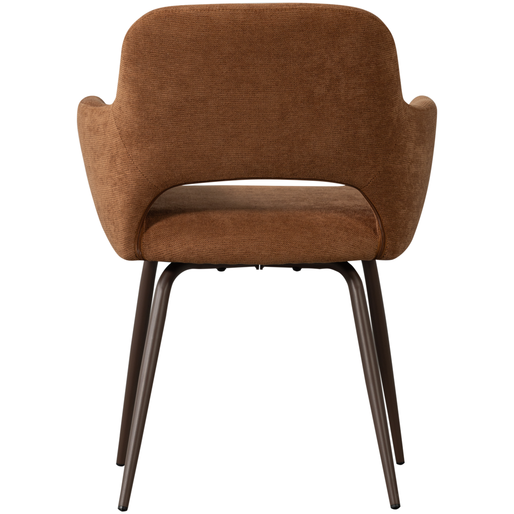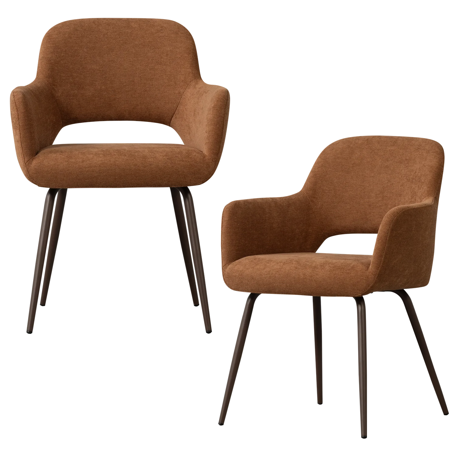Jenny komt uit de collectie van het Nederlandse interieurmerk WOOOD en is bekleed met de zachte Hope geweven stof in een warme bruine tint. Deze plat geweven stof, gemaakt van 100% polyester, voelt prettig aan en valt op door subtiele kleurnuances. Dankzij de hoge Martindale-waarde van 50.000 is de stof bovendien geschikt voor redelijk intensief gebruik, perfect voor een druk huishouden of een gezellige eetkamer waar vaak mensen samenkomen.