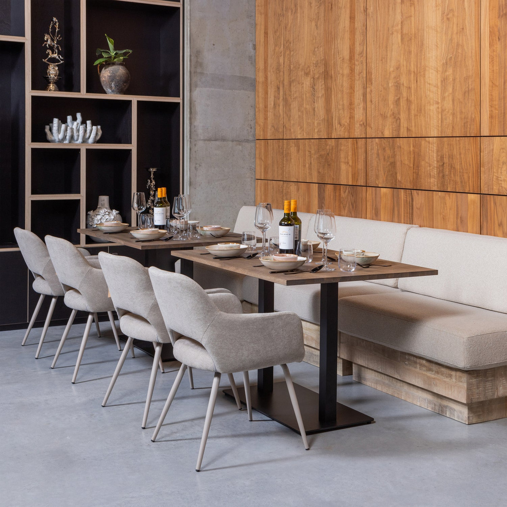 Jenny behoort tot de collectie van het Nederlandse merk WOOOD en is bekleed met de hoogwaardige Hope geweven stof in een naturel tint. Deze plat geweven stof, gemaakt van 100% polyester, voelt zacht aan en valt op door haar subtiele kleurnuances. Dankzij de hoge Martindale-waarde van 50.000 is de stof bovendien geschikt voor redelijk intensief gebruik, ideaal voor een huishouden waar gezellig tafelen centraal staat.