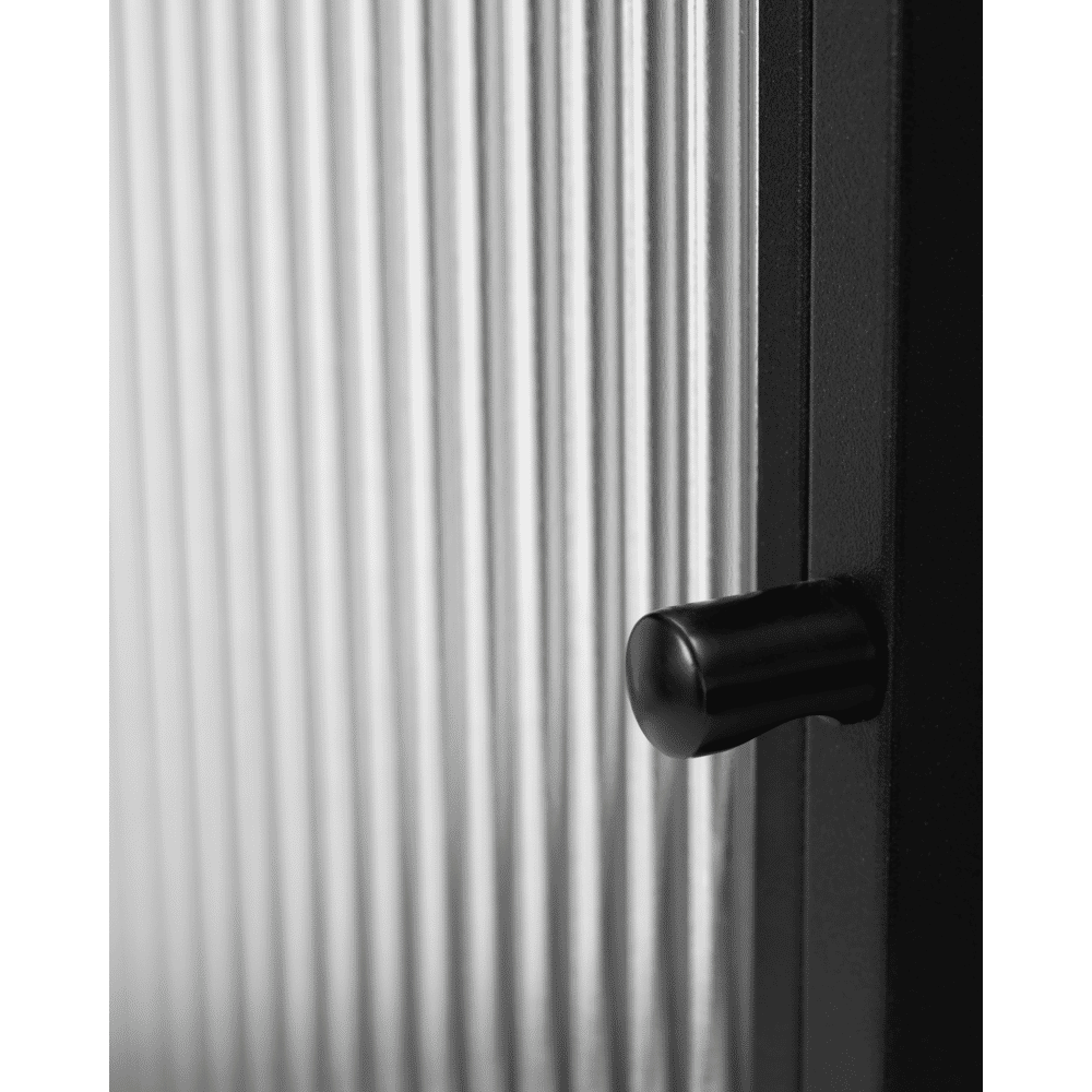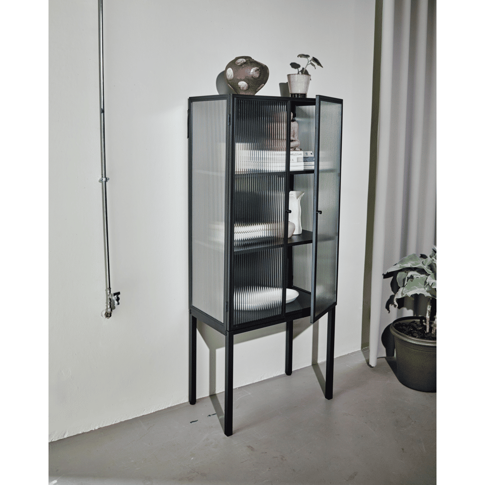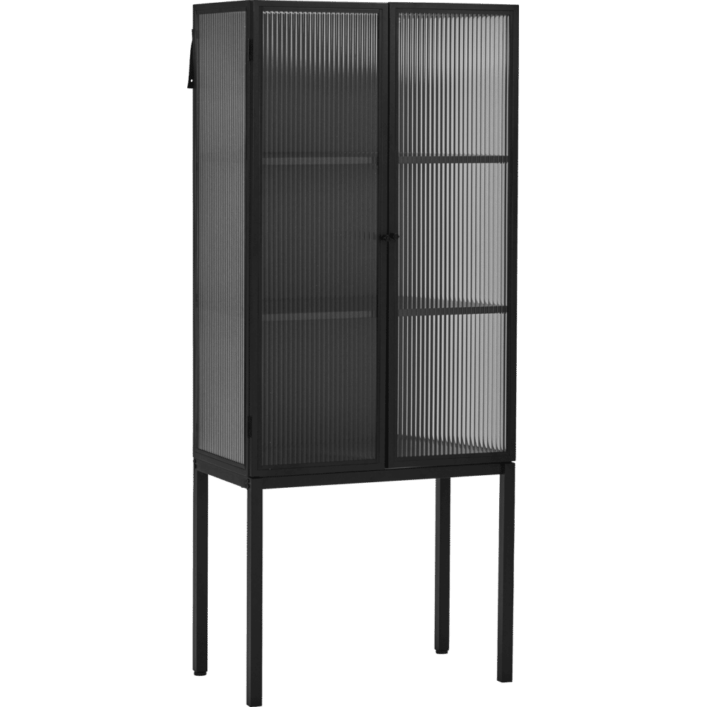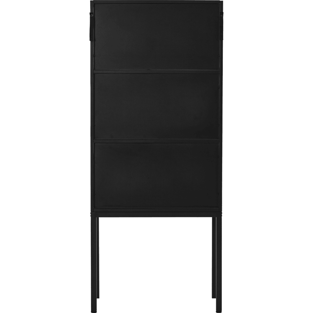 De Cabin kast is uitgevoerd in zwart ijzer en heeft deuren van gehard glas die een subtiel, wazig effect creëren.