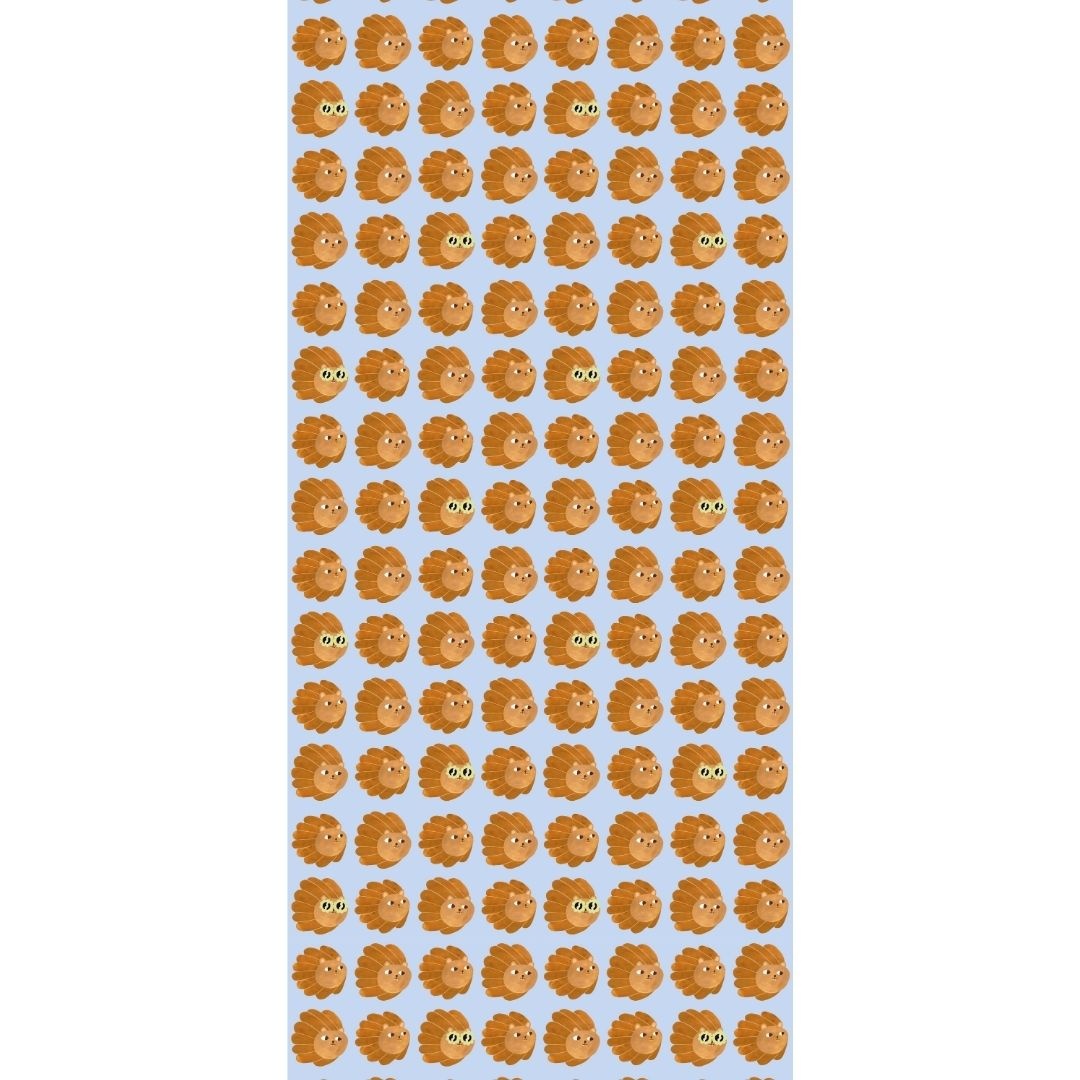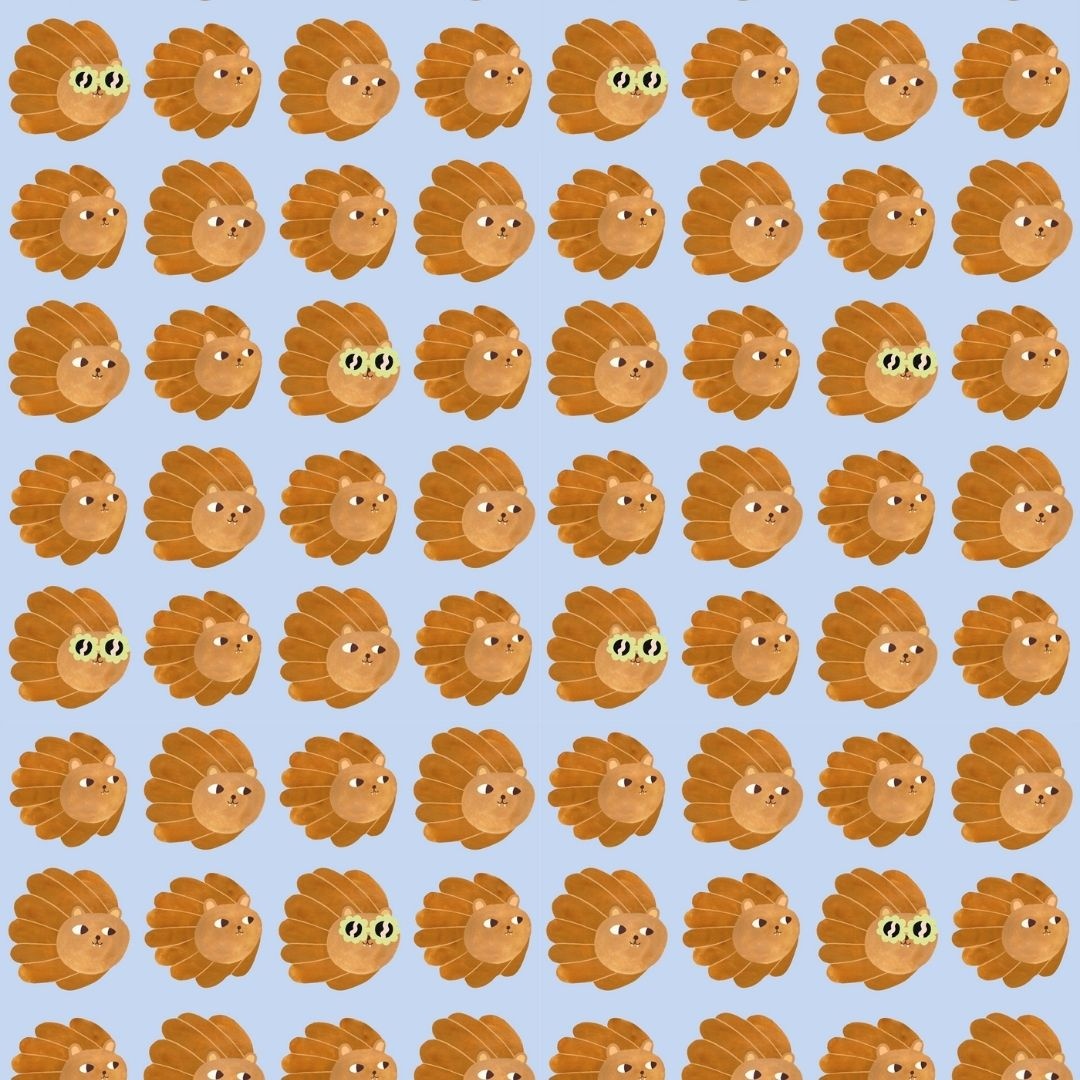 Lion Heads Blue combineert een frisse blauwe achtergrond met handgeschilderde leeuwenhoofden, digitaal verfijnd met speelse details. De brilletjes komen hier terug in een matcha groene tint — een onverwachte kleurcombinatie die het patroon extra karakter geeft.
