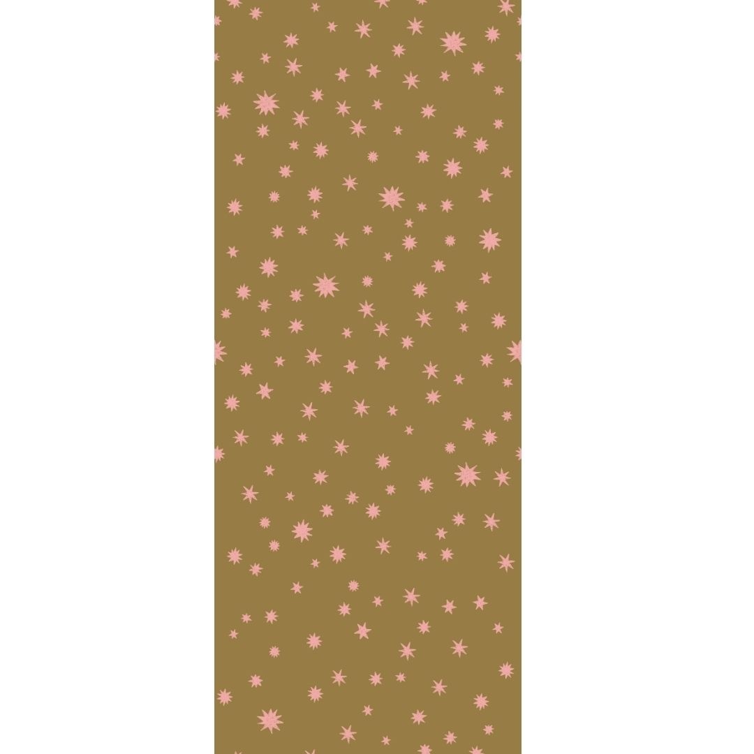 Met Starry Night – Kaki & Roze brengt ontwerper Joëlle Wehkamp een speels en grafisch design naar de kinderkamer. Dit sterren behang laat vrolijke sterren in verschillende groottes dansen over de muur. Het stoere kaki groen in combinatie met de zachte roze sterren zorgt voor een uniek contrast dat zowel krachtig als dromerig oogt.