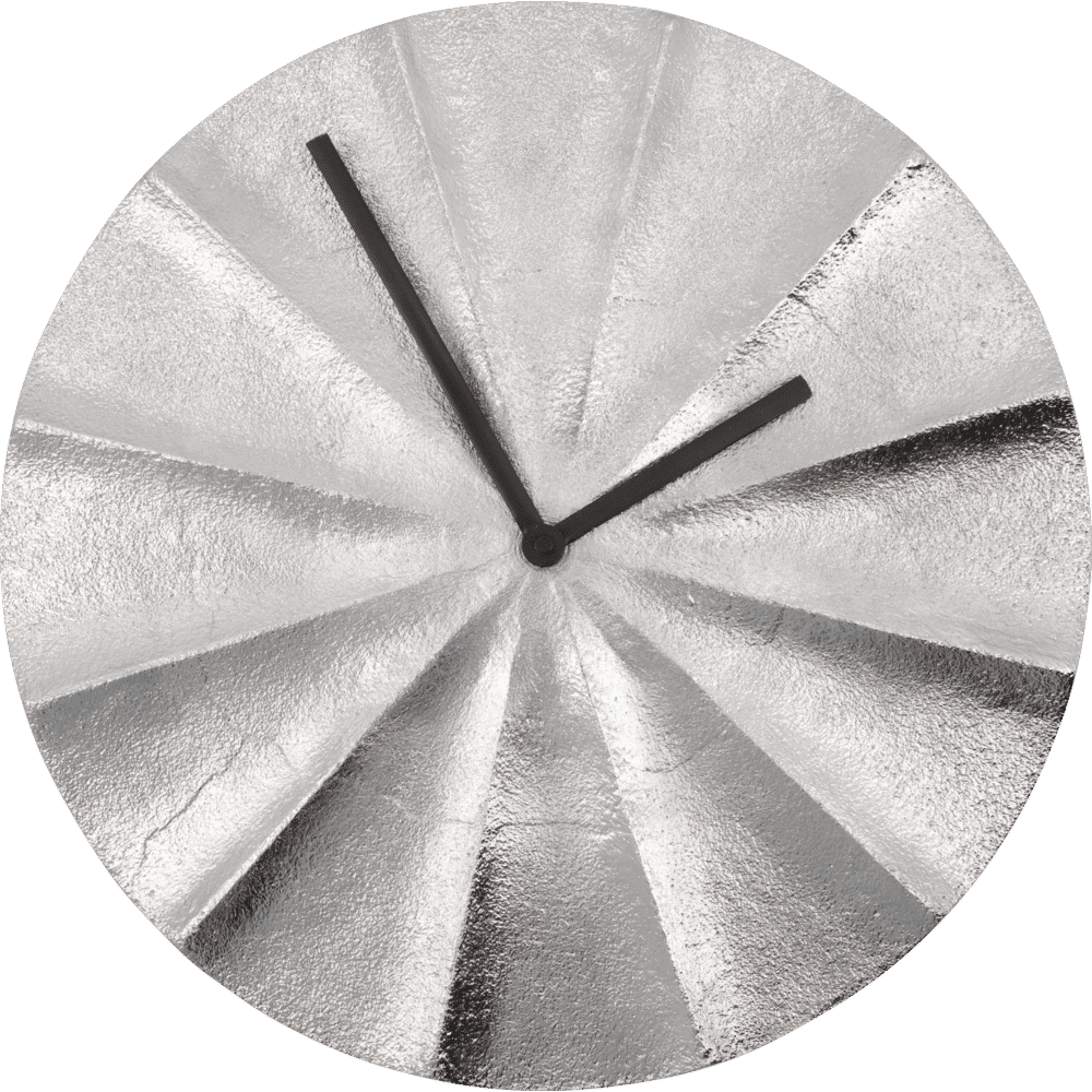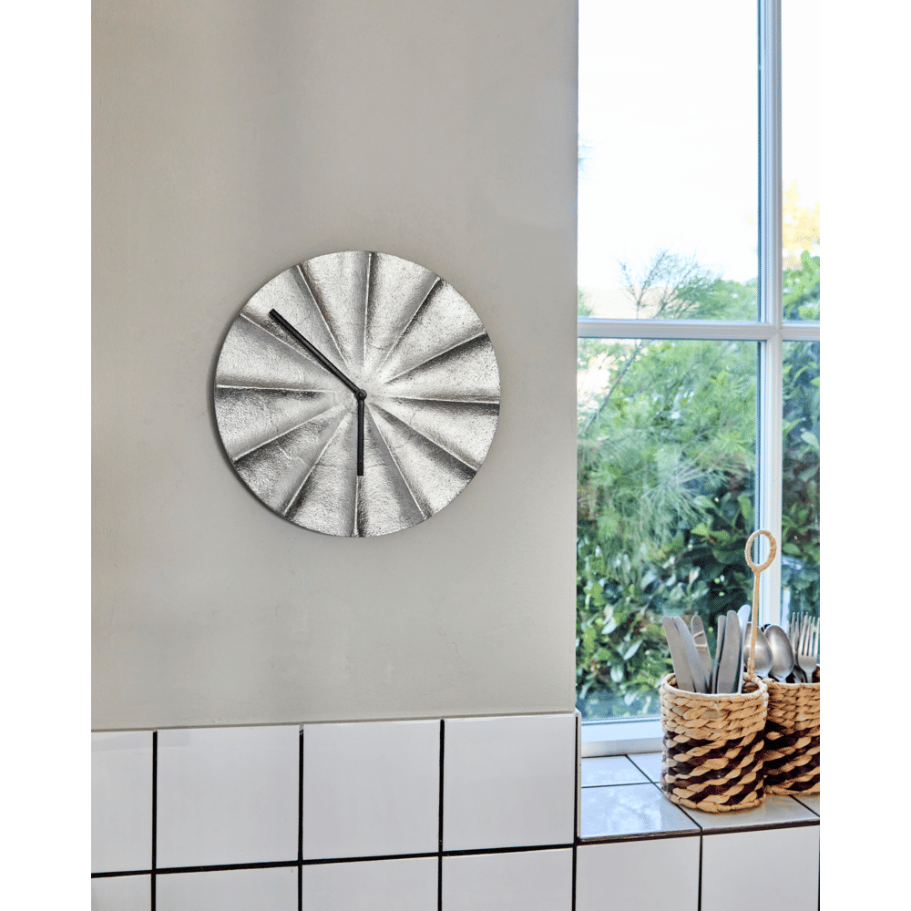 Deze handgemaakte Show klok is ontworpen als een sculpturaal kunstwerk voor aan je muur. De glanzende zilveren afwerking vormt een prachtig contrast met de donkere wijzers in antiek gunmetal. Dankzij de geplooide wijzerplaat ontstaat er een dynamisch lichtspel, waarmee functie en moderne stijl naadloos worden gecombineerd. Batterijen zijn niet inbegrepen.