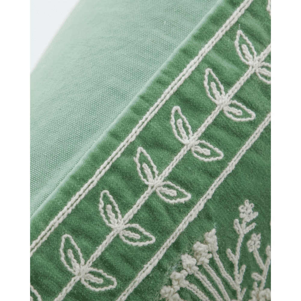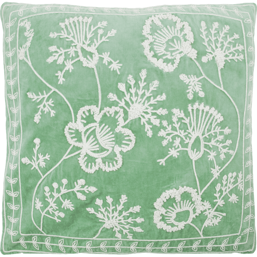 Geef je bank een rustige en naturellijke uitstraling met de Mano kussenhoes. De hoes is gemaakt van katoen en heeft een gestructureerd, zandkleurig borduursel met een botanisch motief op een mintgroene basis.