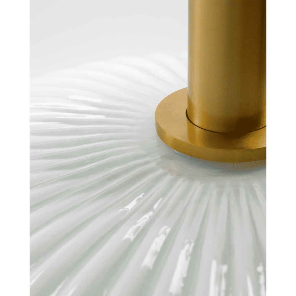 Deze stijlvolle hanglamp combineert een geribbelde glazen kap in gebroken wit met een metalen fitting in antiek messing. Het resultaat? Zacht, diffuus licht dat elke ruimte warmte en elegantie geeft. Hang ‘m boven de eettafel of als eyecatcher in de hal voor een unieke balans tussen klassiek en modern.