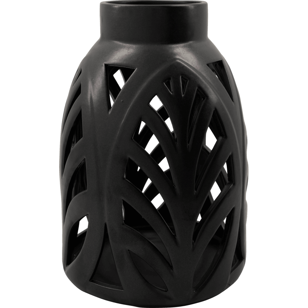 Deze Elm lantaarn is gemaakt van zwart aardewerk en voorzien van een verfijnd, uitgesneden botanisch patroon. Hij creëert een boeiend spel van licht en schaduw en is een sculpturale blikvanger op een bijzettafel of gewoon op de vloer.