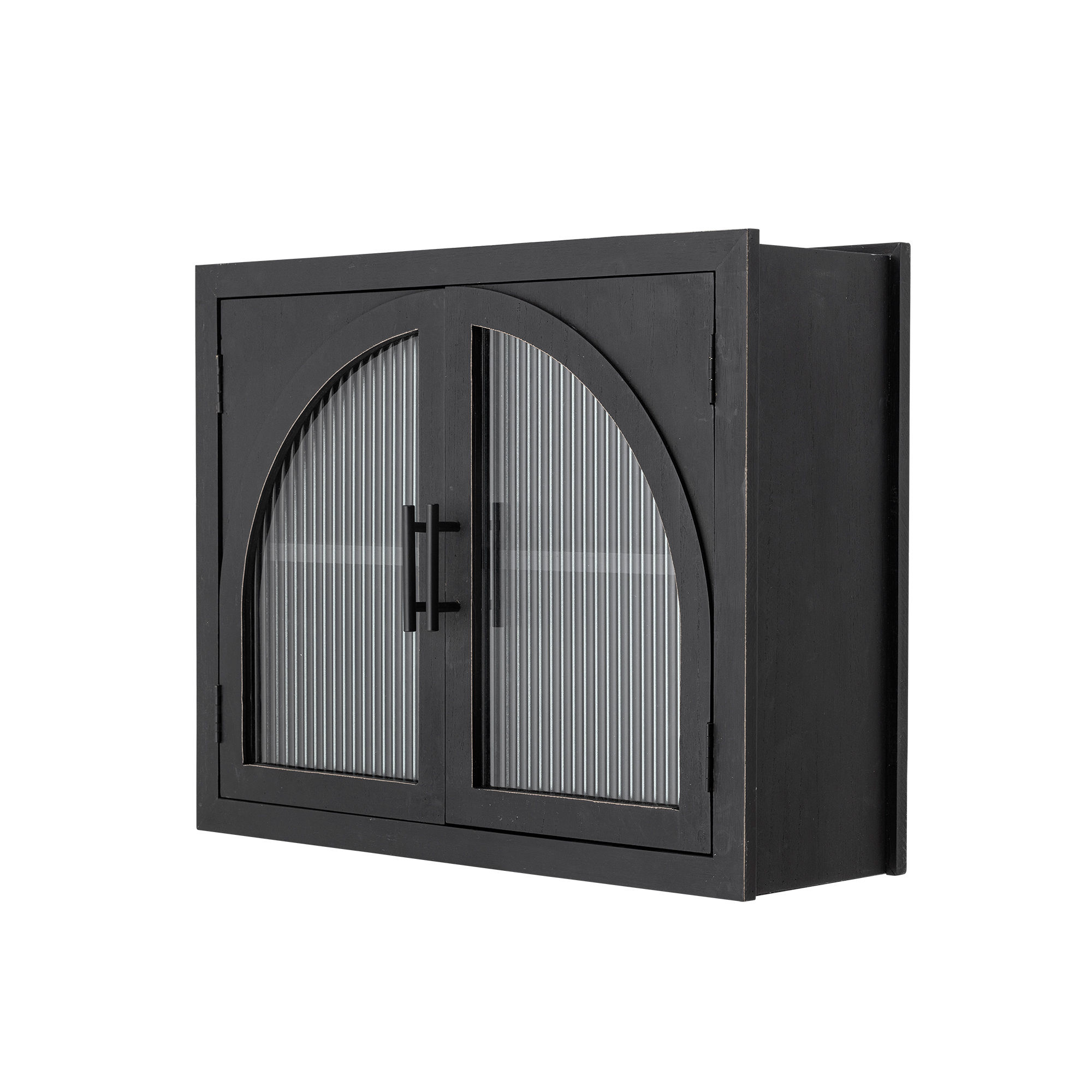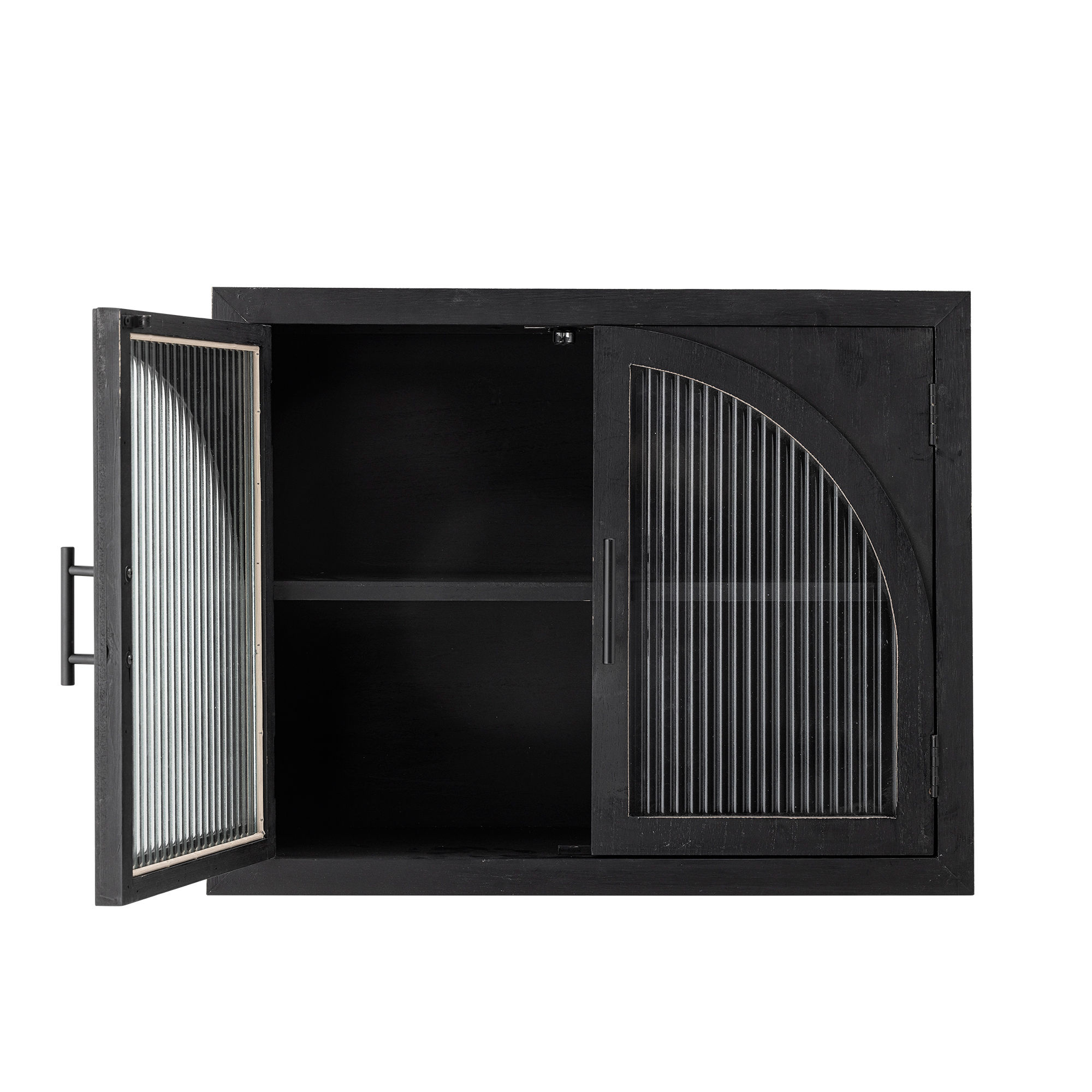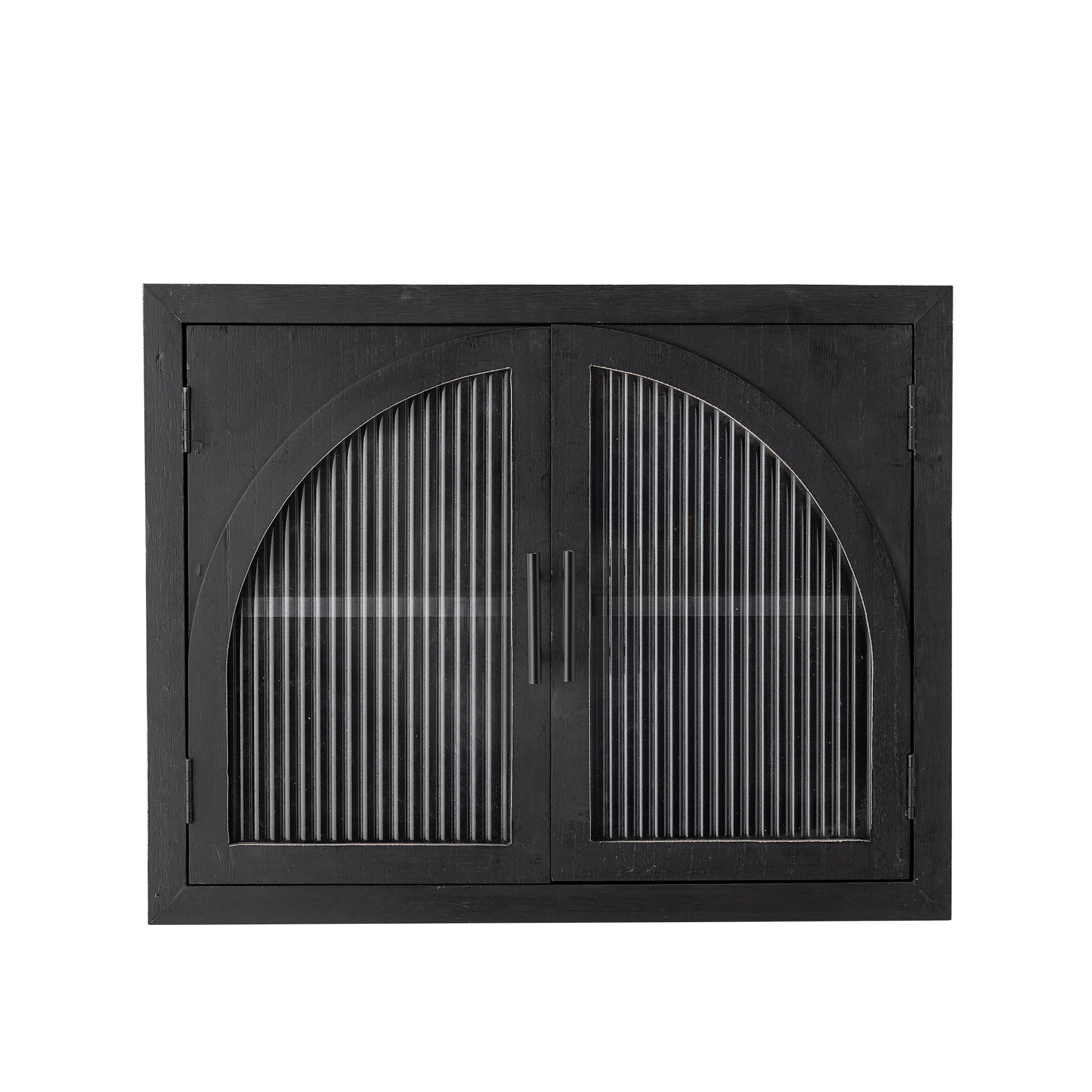 The Lario Cabinet by Bloomingville is a stylish wall cabinet made of pine that brings a cool and modern look to any room. The cabinet's black surface features a lightly distressed look, adding character and depth. The doors are adorned with ribbed glass in an elegant curved design, providing a unique visual element. Perfect for storing and displaying your favorite items.