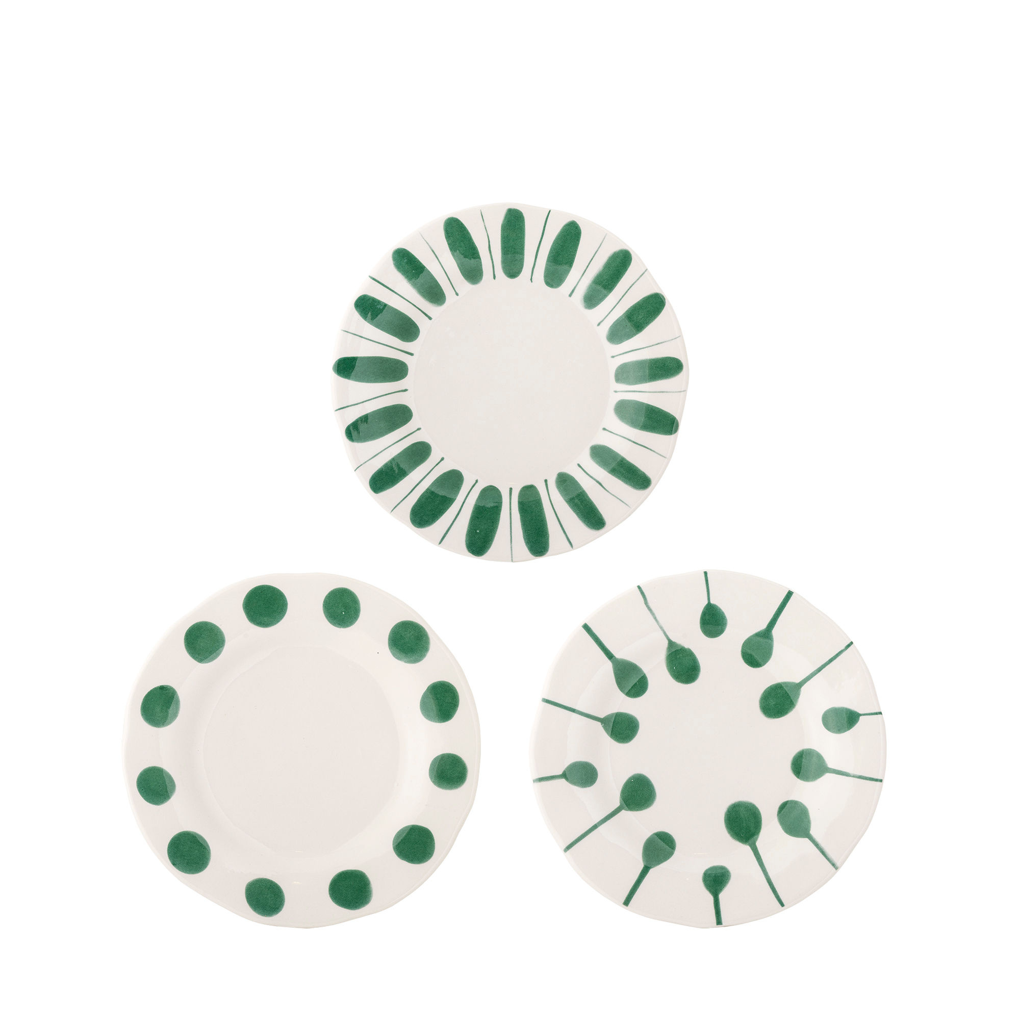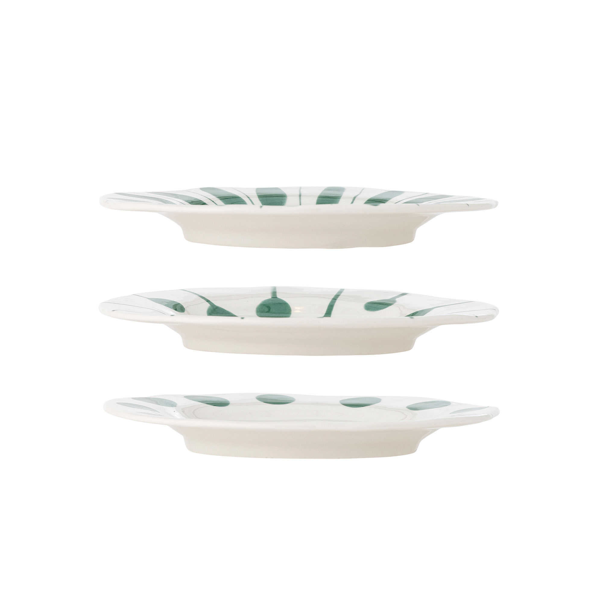 Deze set van drie Linora borden combineert een zachte witbasis met handgeschilderde groene lijnen, dots en penseelstreken. Elk bord heeft een licht gebogen rand die het servies een rustige, speelse elegantie geeft. Kleine variaties in patroon maken elk stuk uniek.