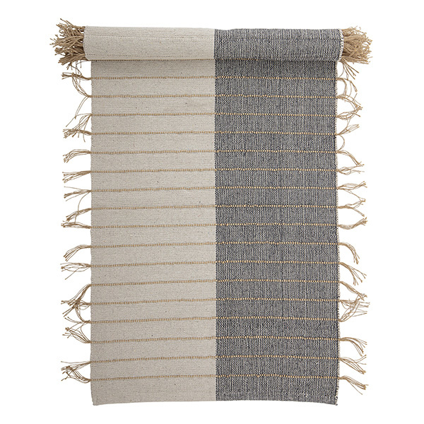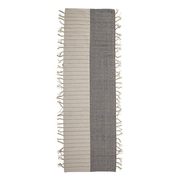Het Aciano Vloerkleed van Bloomingville is een prachtig geweven vloerkleed gemaakt van katoen en andere vezels. Het vloerkleed heeft een zeer stijlvol ontwerp, dat bestaat uit twee verticale strepen in grijs en natuurkleur, gekruist door gele vezels die eindigen in franjes. Het zal een waar genoegen zijn om er op blote voeten op te lopen.