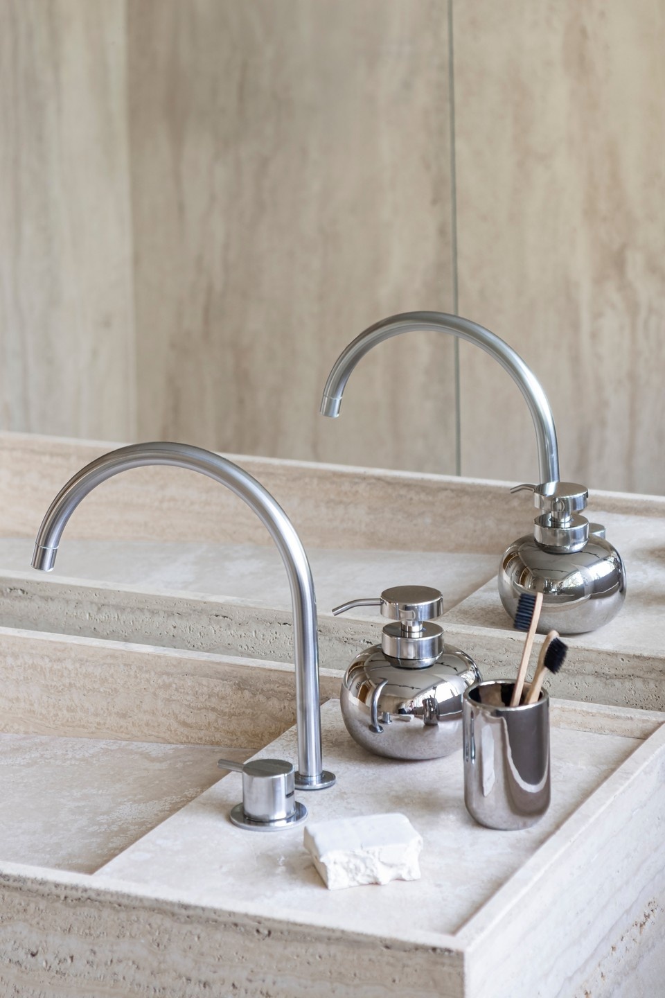 De LOTUS dispenser van Mette Ditmer in laag model combineert een afgeronde, organische vorm met een spiegelende chroomafwerking. Het resultaat is een stijlvol en subtiel object dat perfect past op de rand van je wastafel of aanrecht.