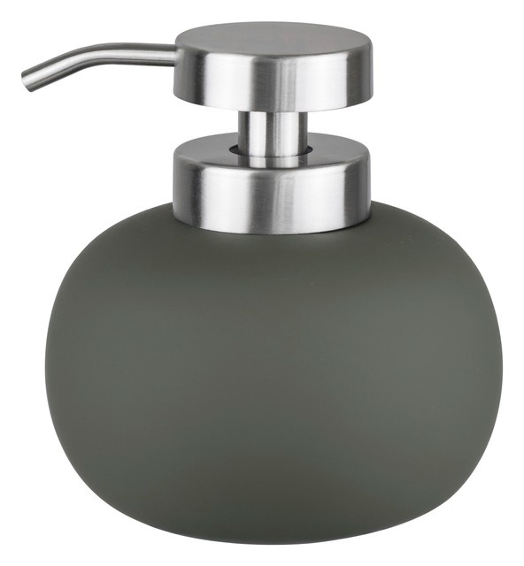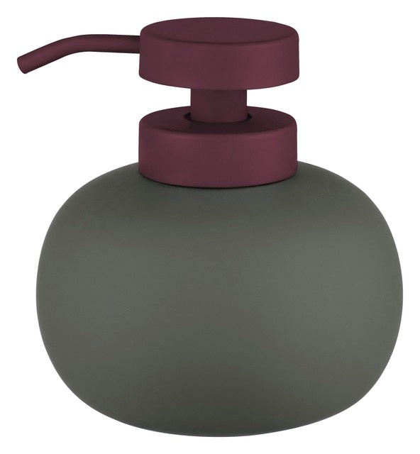 De LOTUS PLAY dispenser in donkere olijftint is een rustgevend accent in elke badkamer of keuken. De matte rubbercoating voelt zacht aan en geeft het keramiek een natuurlijke uitstraling, terwijl de wijnrode pomp een onverwachte, speelse kleurtoets toevoegt.