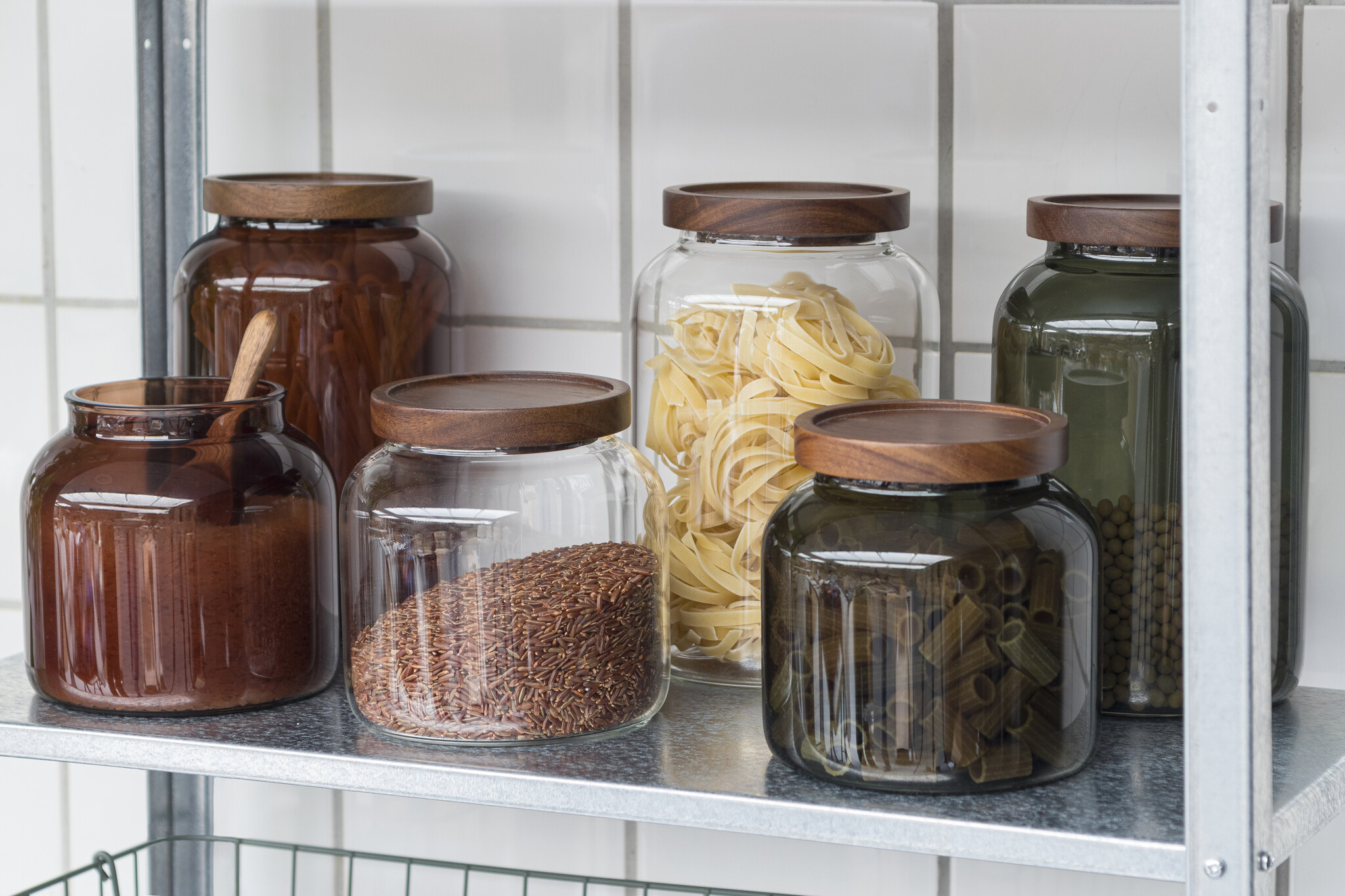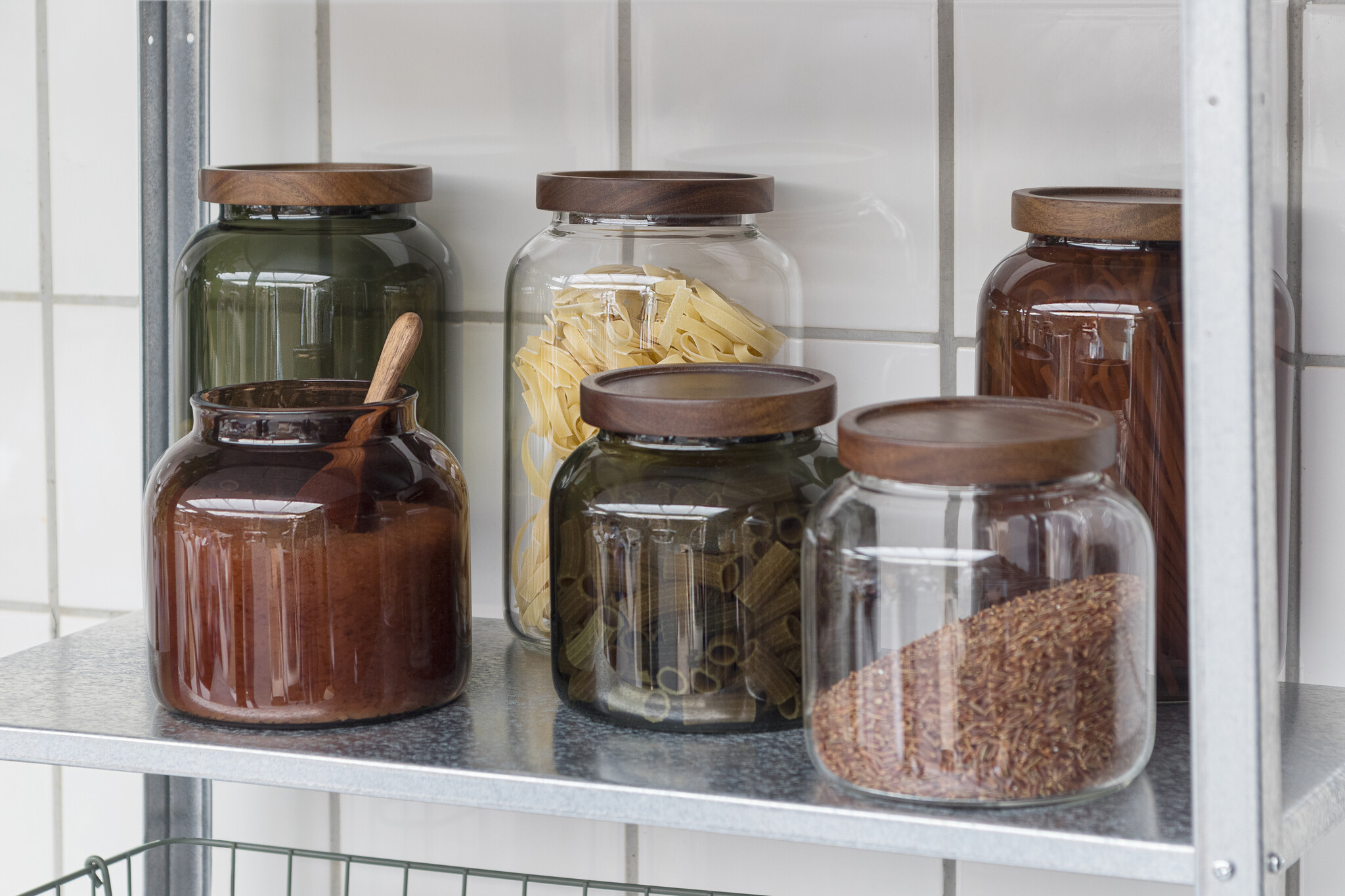 Organiseer je huis met de grote LUNA glazen pot van transparant glas. Met een ruim ontwerp en een deksel van donker geoliede acaciahout combineert hij functionaliteit met elegantie. De siliconen afsluiting zorgt voor een luchtdichte afsluiting, waardoor hij ideaal is voor het bewaren van etenswaren zoals pasta, rijst en gedroogde bonen. Door de hoge vorm is hij ook perfect voor het bewaren van keukengerei of zelfs als decoratieve vaas voor bloemen.
