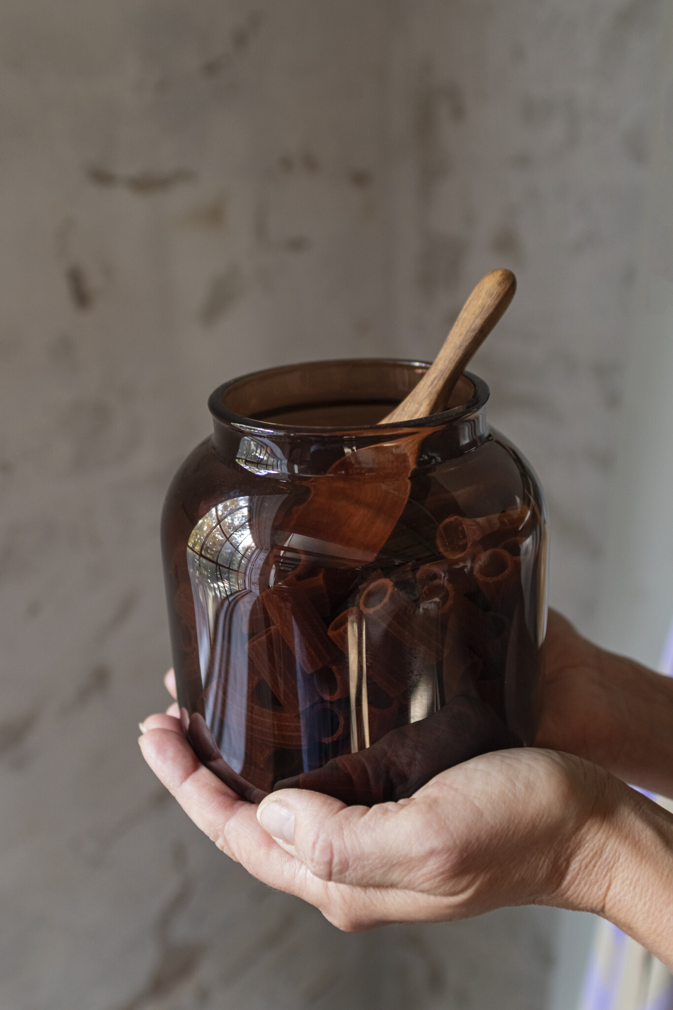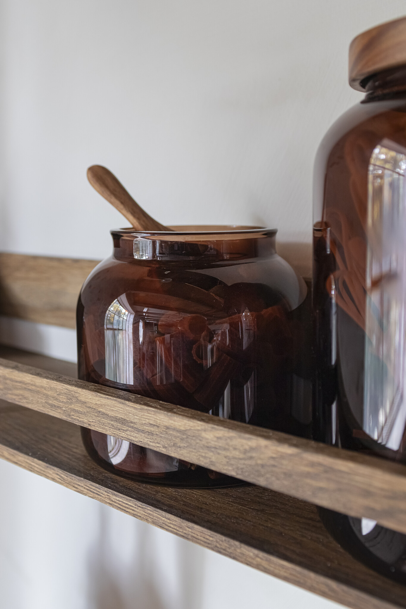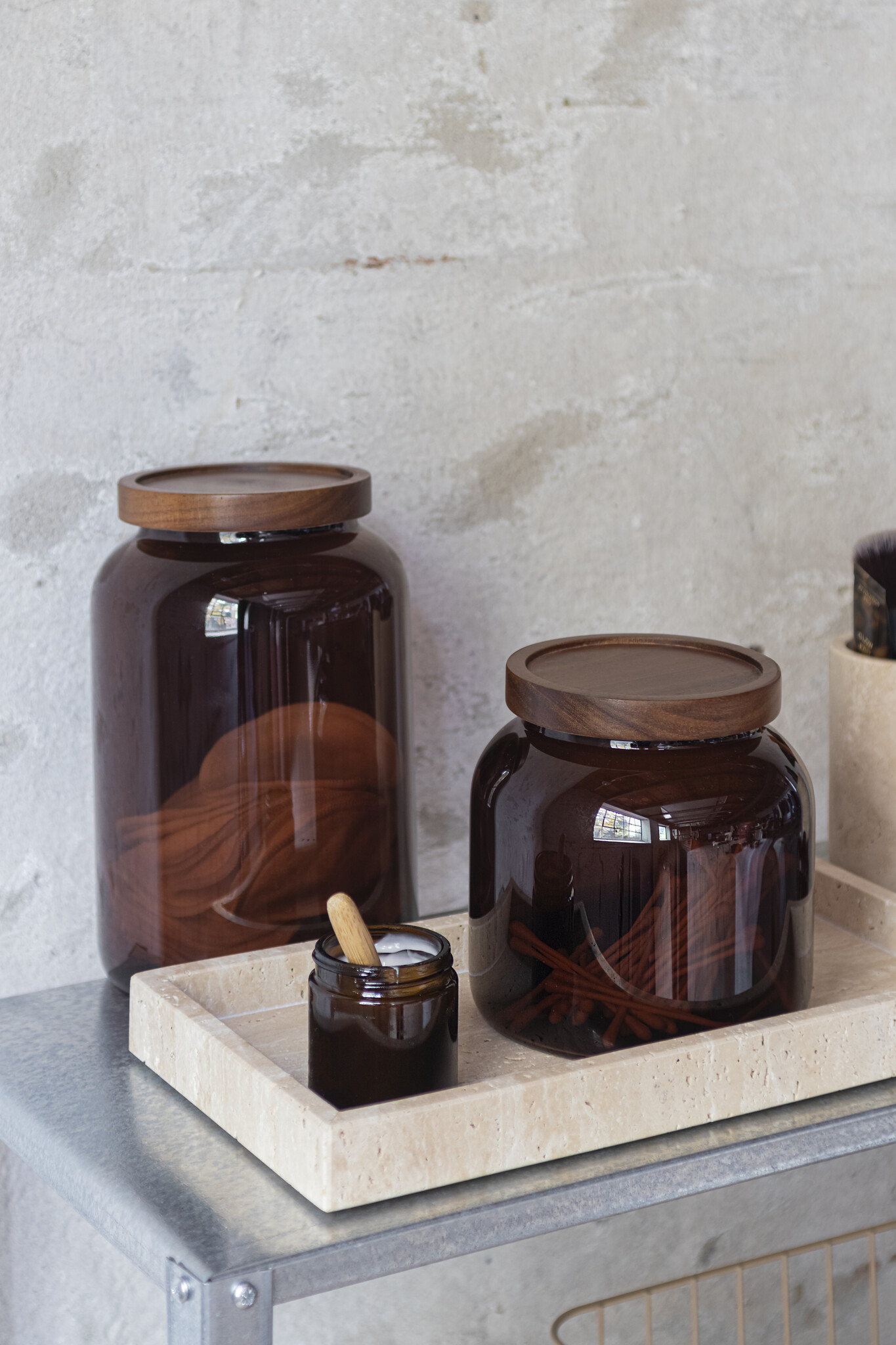 De kleine LUNA glazen pot in een warme bruine tint combineert functionaliteit en esthetiek naadloos. De organische, ronde vorm in combinatie met een deksel van donker geoliede acaciahout maakt hem zowel praktisch als decoratief. Het deksel is voorzien van een siliconen afdichting, waardoor hij luchtdicht afsluit. Perfect voor het bewaren van etenswaren zoals pasta, granen en zaden in de keuken. Door het compacte formaat is hij ook ideaal voor badkamerbenodigdheden zoals wattenschijfjes, wattenstaafjes of haaraccessoires. Combineer hem met andere maten en kleuren uit de LUNA-serie voor een samenhangende of speelse look. - Was-/onderhoudsinstructies: Met de hand wassen of afnemen met een vochtige doek. - Was-/onderhoudsinstructies: Met de hand wassen of afnemen met een vochtige doek. - Materiaal: Glas, acaciahout