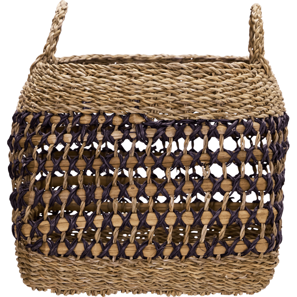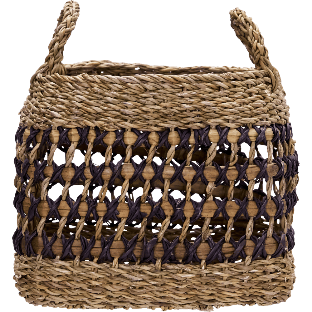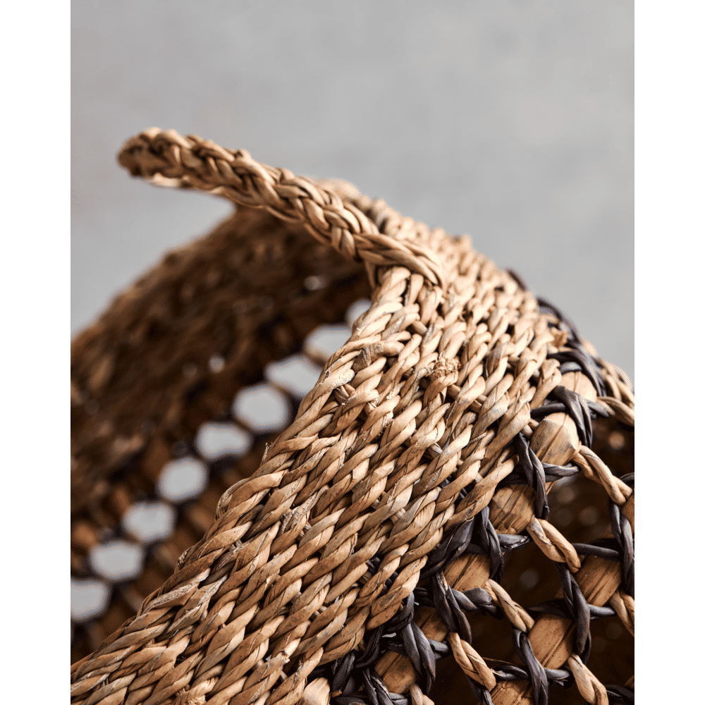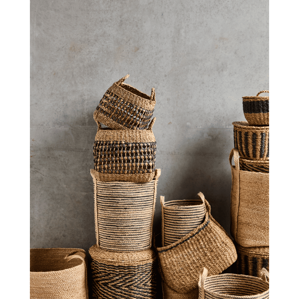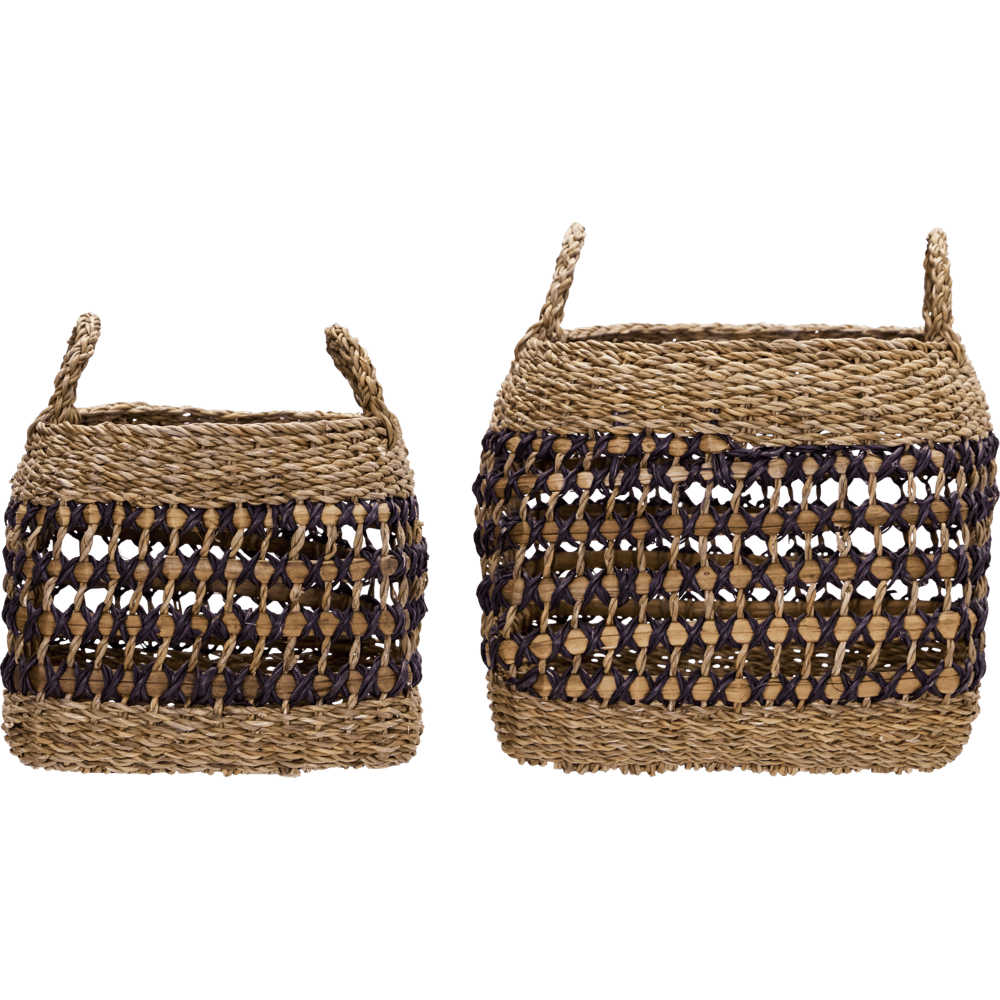 Met deze set van twee handgemaakte manden van zeegras geef je je interieur direct een modern en natuurlijk accent. De zwarte grafische lijnen doorbreken de zachte tinten en voegen speelsheid toe aan hun robuuste uitstraling. Perfect voor plaids, speelgoed of planten.