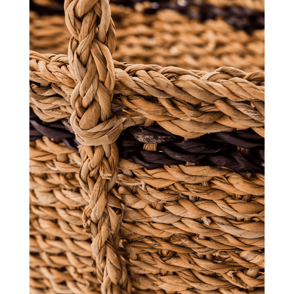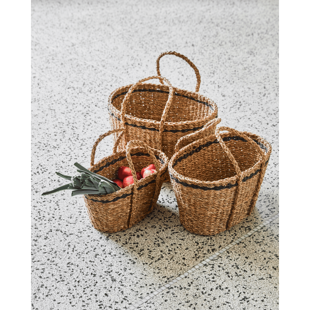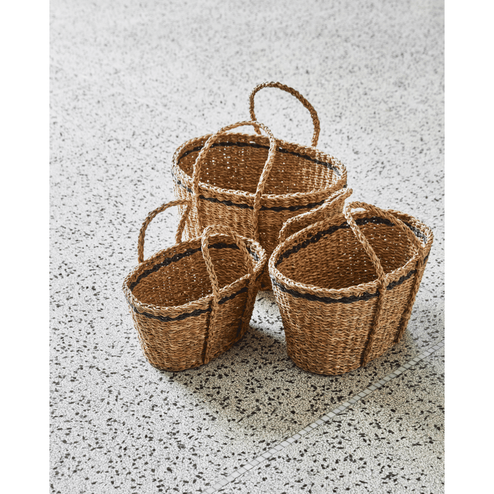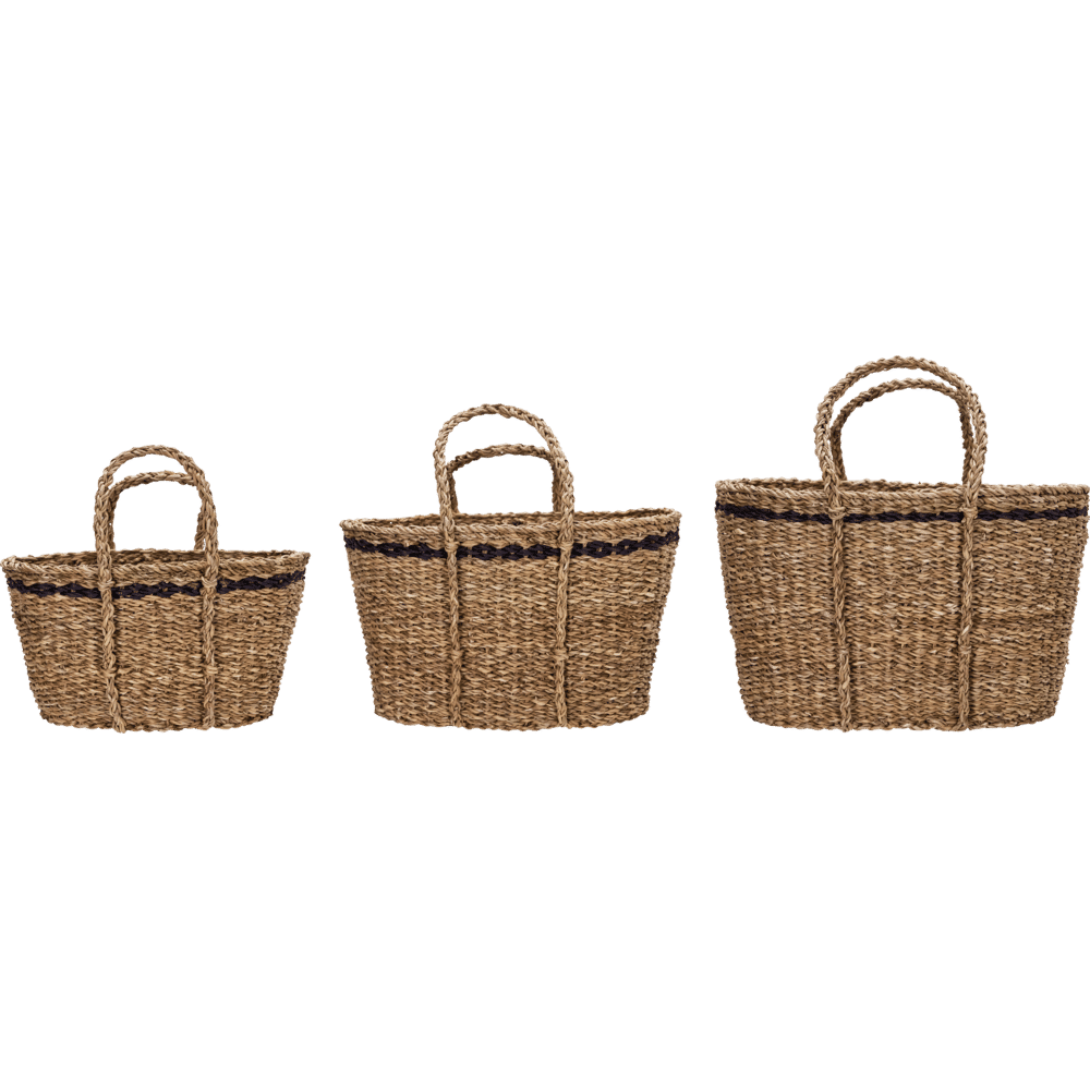Deze set van drie handgevlochten manden van natuurkleurig zeegras brengt direct warmte en rust in je interieur. Het subtiele donkerbruine accent en de stevige handvatten maken praktische opbergruimte tot een stijlvol statement. Gebruik ze naast de bank voor plaids, in de hal voor tijdschriften of in de slaapkamer voor speelgoed.