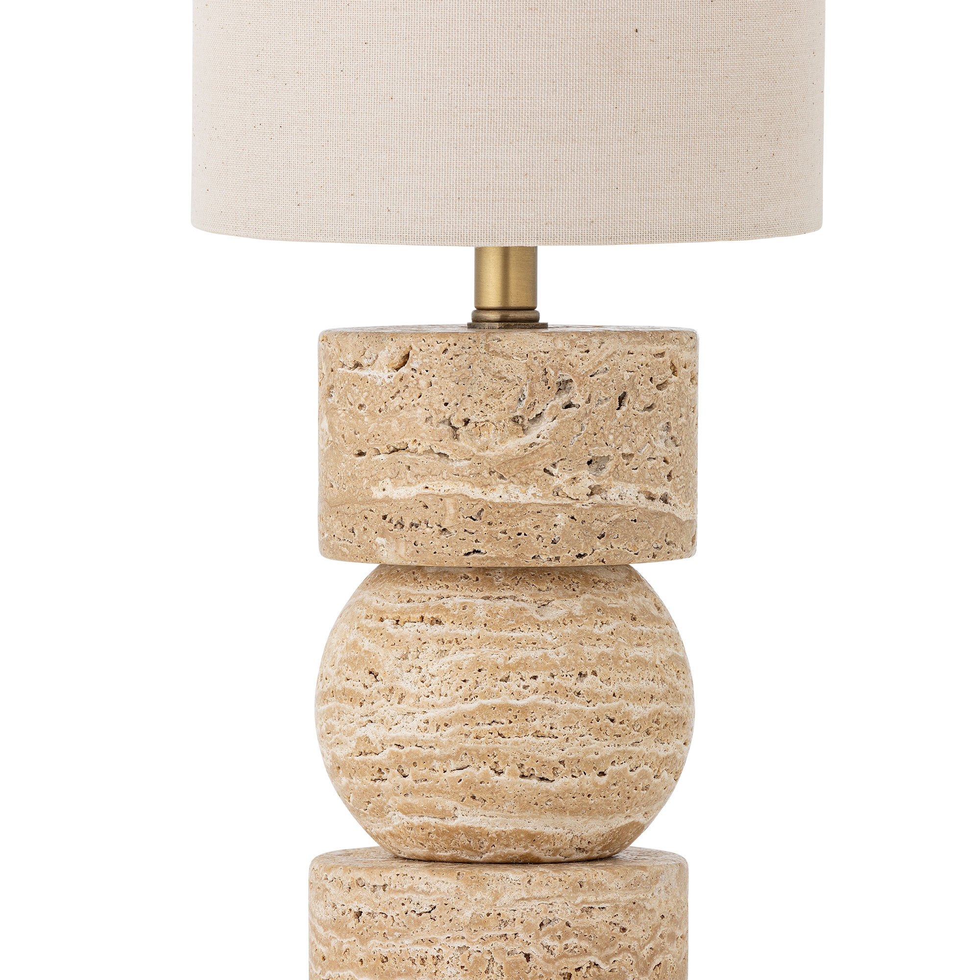 De Marci tafellamp van Bloomingville brengt rust en luxe samen in één ontwerp. De sculpturale voet van travertijn heeft een unieke textuur en kleurverloop, waardoor elke lamp net even anders is. De linnen kap in zacht beige zorgt voor een diffuus, warm licht.