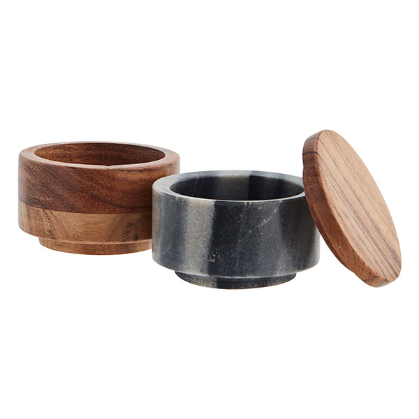 De opberger bestaat uit twee stapelbare bakjes: één bakje van warm naturel acaciahout en één bakje van verfijnd lichtgroen marmer, afgemaakt met een houten deksel. Perfect voor het serveren van je favoriete hapjes, peper en zout, of voor een smaakvolle presentatie van olijfolie met zout en stokbroodjes. Maar deze veelzijdige opberger kan ook dienen als een sieradendoosje in de slaapkamer, waar je je mooiste accessoires stijlvol kunt opbergen.