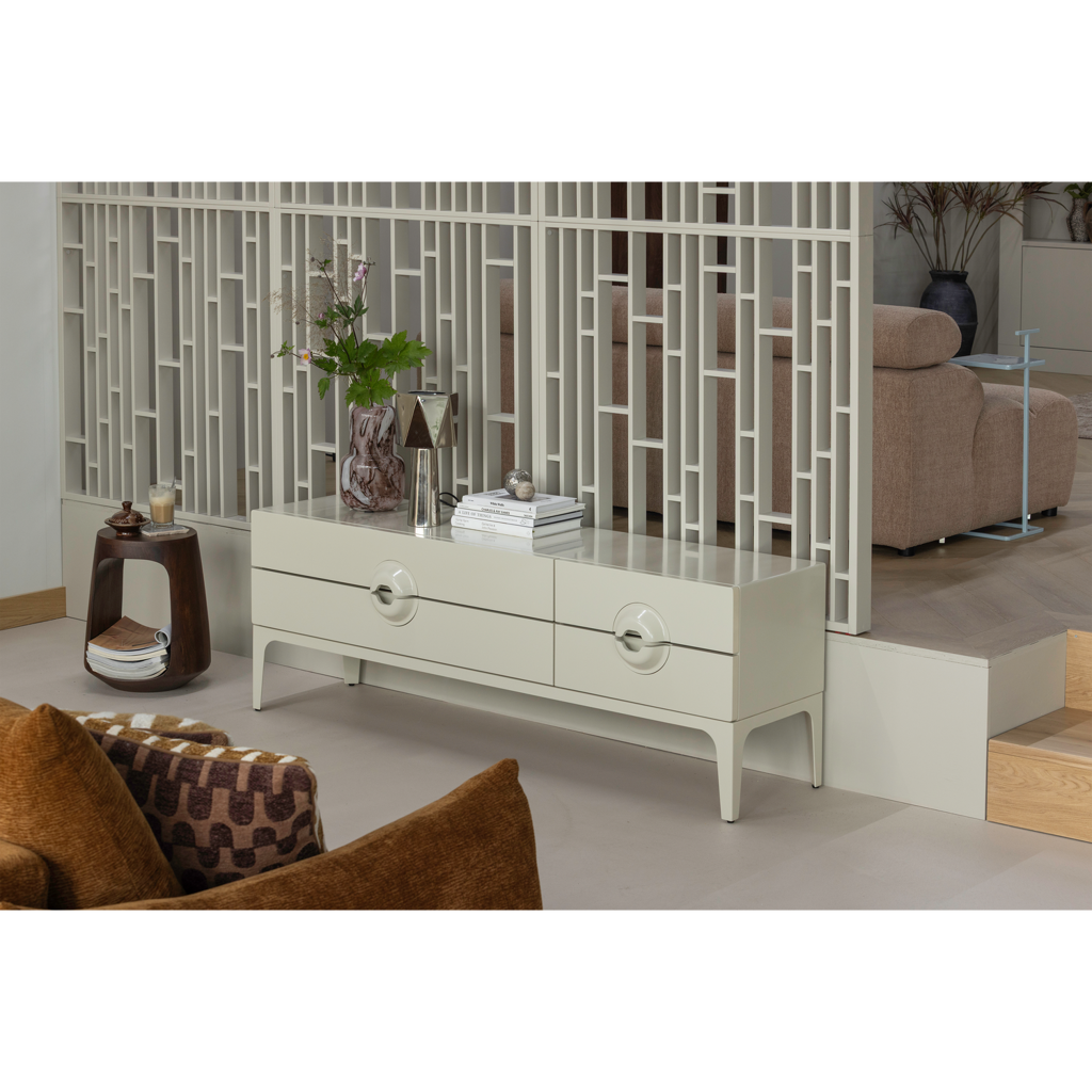 Voor wie houdt van een subtiel en stoer interieur: de Merge tv-kast in matte “dust”-kleur, eucalyptushout, metalen poten en aparte grepen vormt een stijlvolle basis in je woonkamer met functionele opbergruimte.