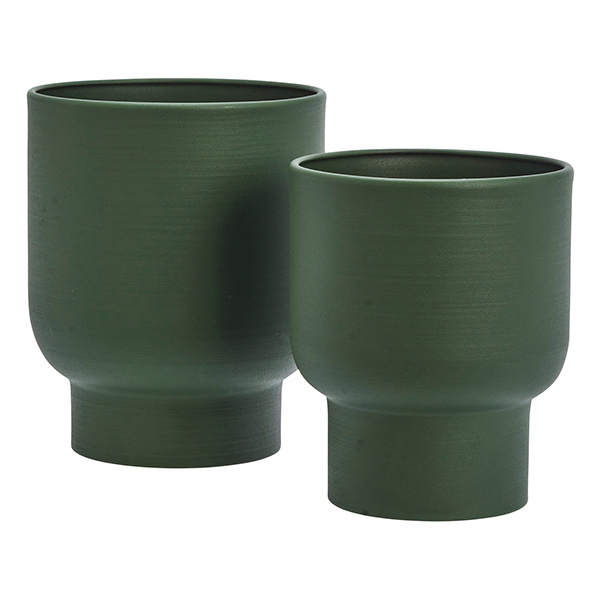 Deze set van 2 metalen bloempotten in matgroen brengt rust en balans in je interieur. De zachte matte coating geeft een natuurlijke uitstraling die prachtig samengaat met kamerplanten. Dankzij de verschillende formaten creëer je moeiteloos een speels effect op vensterbanken, planken of tafels.