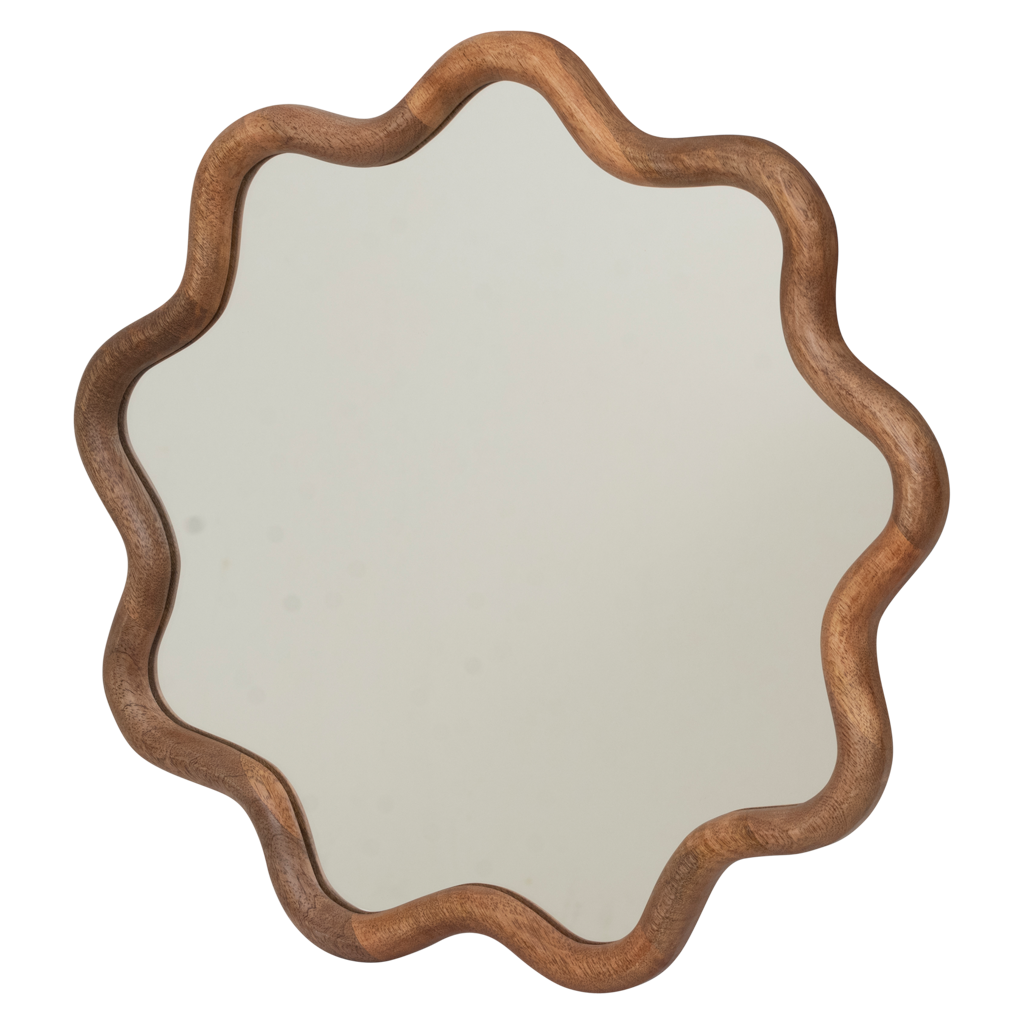 Omdat de spiegel handgemaakt is van mangohout, kan de kleur of structuur iets variëren. Dit benadrukt juist het unieke karakter van elk exemplaar. De spiegel is eenvoudig schoon te houden met een droge doek, waardoor hij altijd zijn natuurlijke uitstraling behoudt.