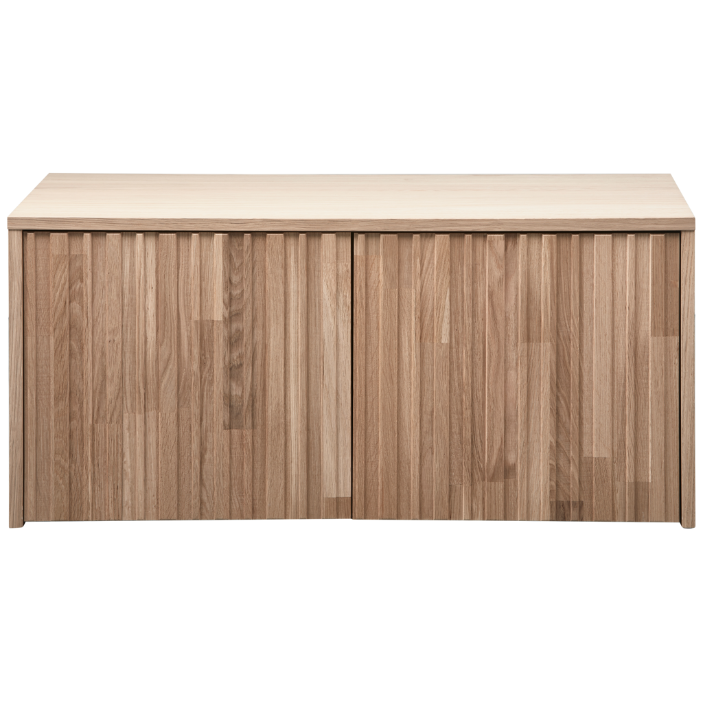 De kistbank is vervaardigd uit eikenhout, een duurzame houtsoort met een lichtbruine tint en een zachte gele ondertoon. De zichtbare nerftekening geeft het meubel een natuurlijke en warme uitstraling. Het gebruikte eikenhout is 100% FSC-gecertificeerd, wat bijdraagt aan een verantwoorde en milieuvriendelijke keuze.