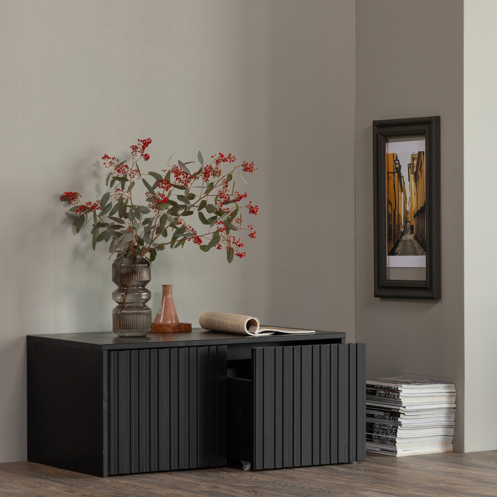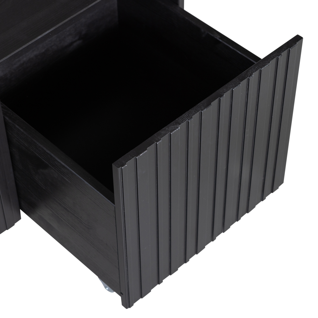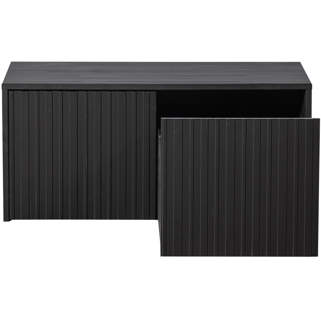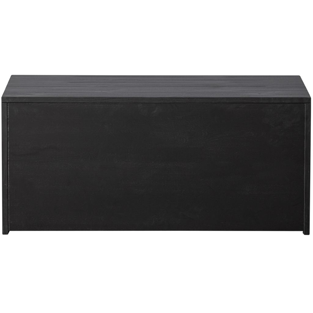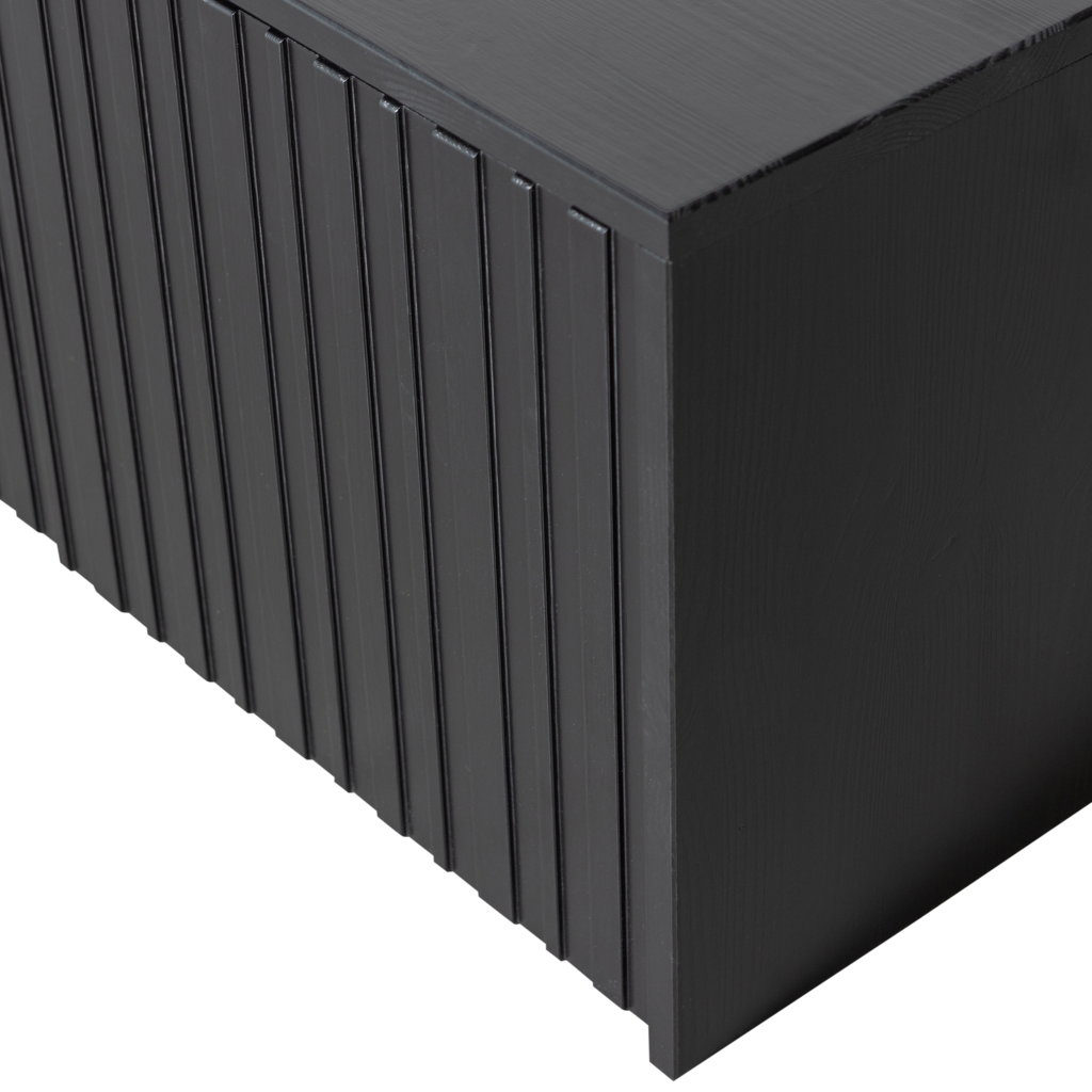 Gebruik de kistbank in de hal, slaapkamer of woonkamer en berg eenvoudig schoenen, plaids of accessoires op. Het grafische reliëf en de diepe zwarte beits geven het meubel een stoere, moderne uitstraling die perfect past in diverse interieurstijlen.