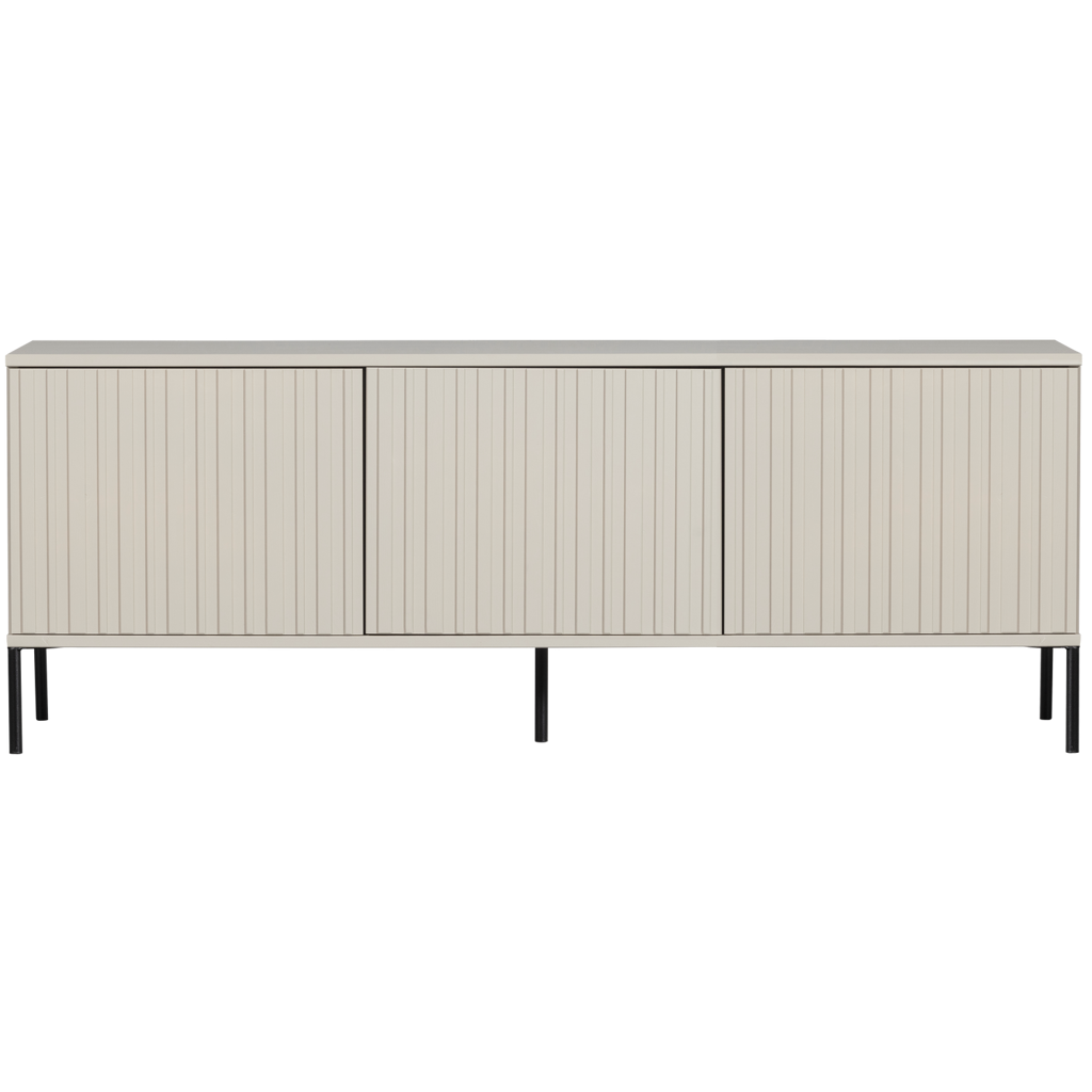 Het tv-meubel is uitgevoerd in grenenhout met een dustkleurige lak en heeft greeploze deuren met een grafisch reliëf. Het zwarte metalen onderstel geeft een stoere, luchtige uitstraling.