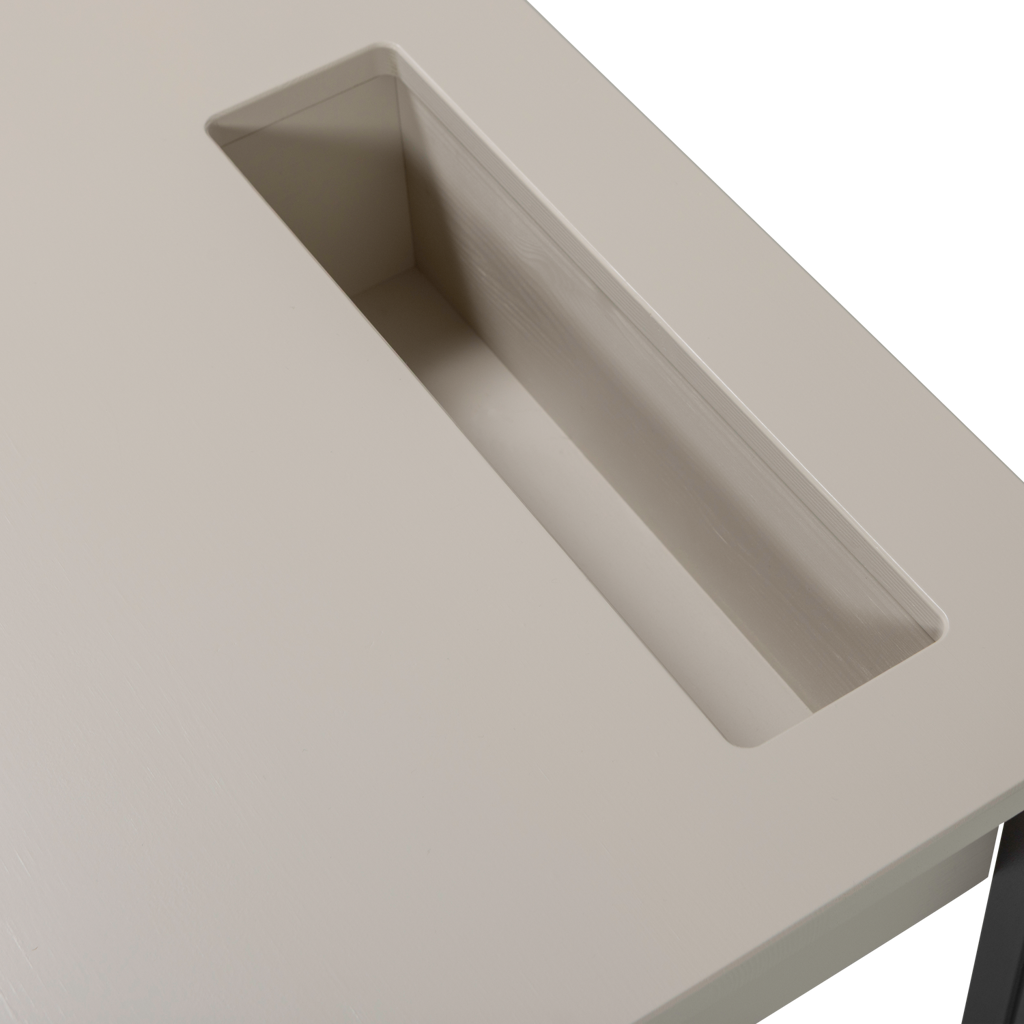 Het bureau is vervaardigd uit FSC-gecertificeerd grenenhout, gladgeschuurd en afgewerkt in een verfijnde zandkleur. De lade is voorzien van een zwarte HDF-bodem en biedt ruimte voor kleine kantoorbenodigdheden. Het stevige metalen frame in zwart contrasteert mooi met het lichte hout en zorgt voor stabiliteit zonder zwaar te ogen.