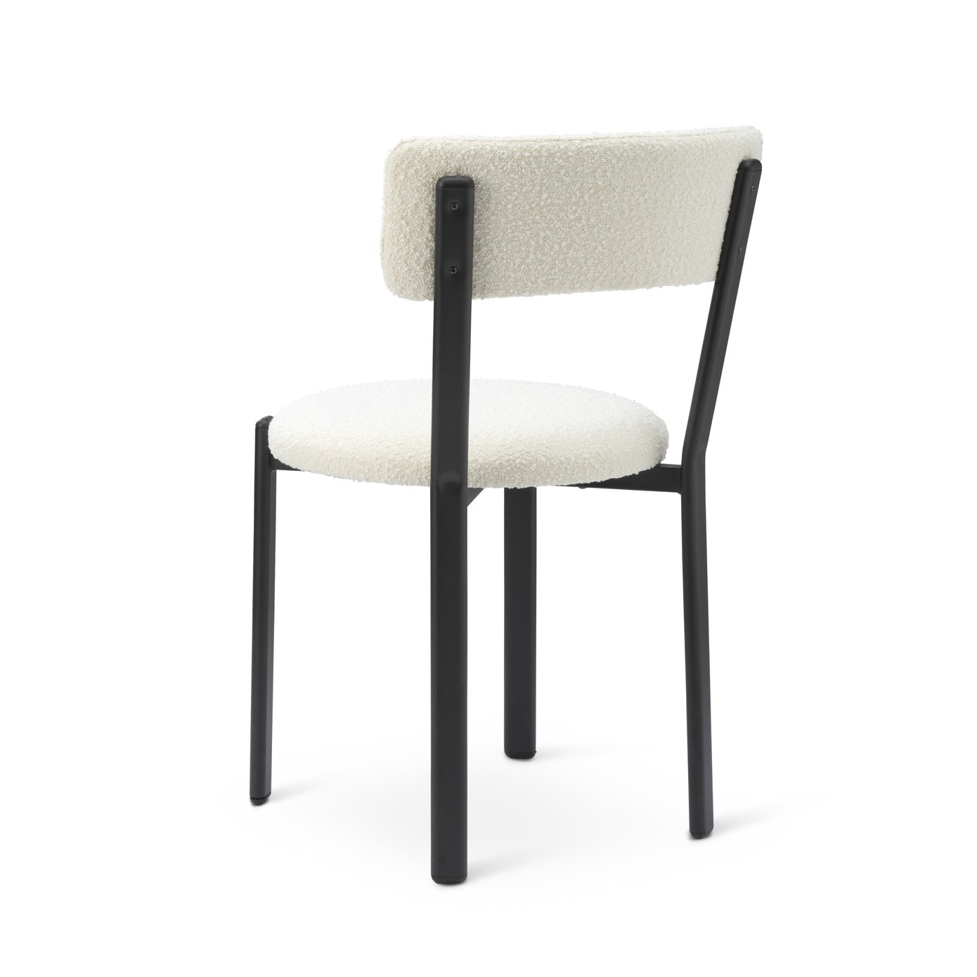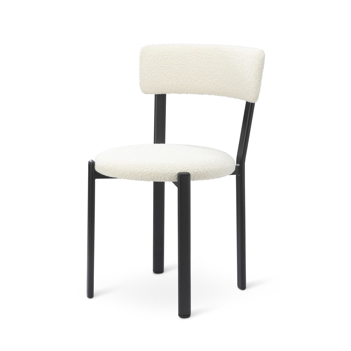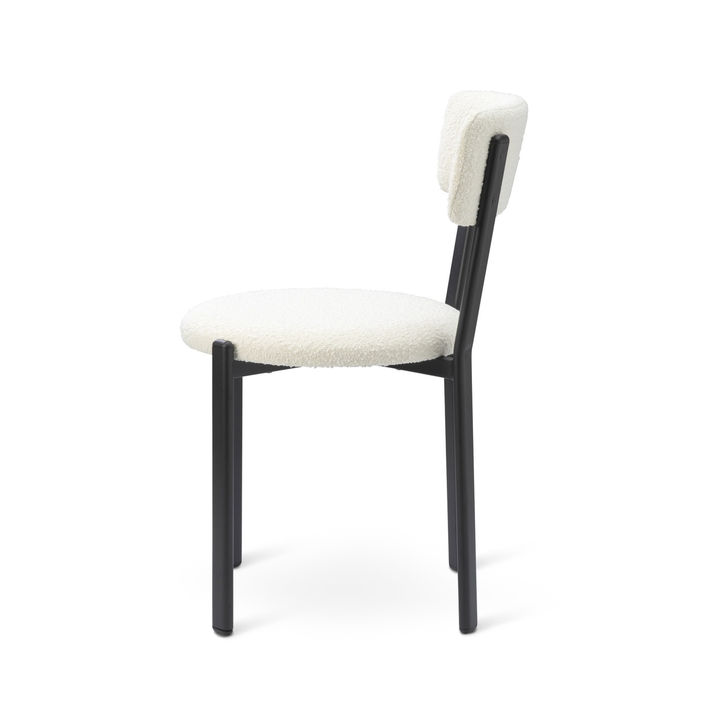 De Obu eetkamerstoel heeft een ogenschijnlijk simpel uiterlijk maar verrast in opvallende details en zitcomfort. Zo is de bekleding een bescheiden bouclé in vier net zo bescheiden kleuren die heel goed onderling gemixt kunnen worden.