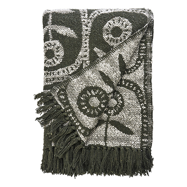 Deze stijlvolle plaid van Madam Stoltz is een ode aan vakmanschap en hergebruik. De plaid is handgeweven in India van 100% gerecycled katoen en combineert donkergroen met off white in een bloemendessin geïnspireerd op de grafische patronen uit de jaren ’50. Omkeerbaar en stijlvol aan beide zijden.