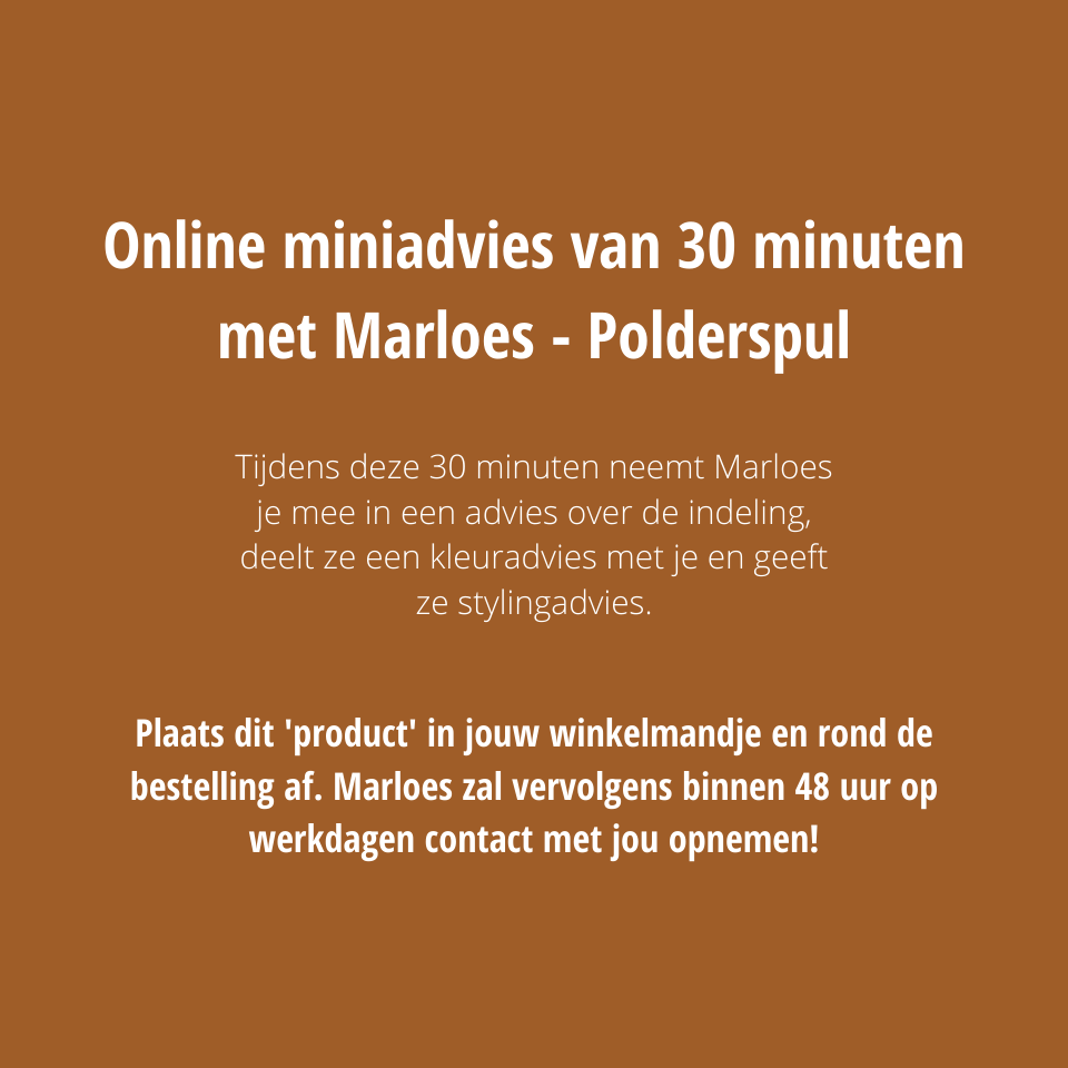 Tijdens deze 30 minuten neemt Marloes je mee in een advies over de indeling, deelt ze een kleuradvies met je en geeft ze stylingadvies.