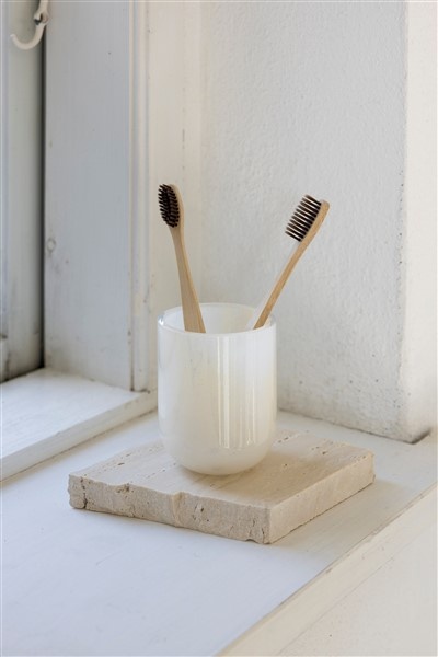 De OPAL tandenborstelhouder in linnen brengt rust en evenwicht in je badkamer. Het opaalglas heeft een lichte, bijna vloeibare uitstraling die subtiel verandert met het licht. De zachte, afgeronde vormen en warme tint geven een spa‑achtige sfeer.