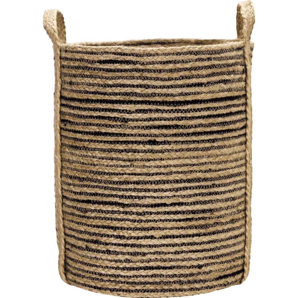 Deze handgemaakte jute manden met zwart/naturel streeppatroon voegen een robuust en natuurlijk accent toe aan je interieur. Met hun royale formaat en stevige structuur zijn ze ideaal voor grotere items zoals dekens, kussens of wasgoed. Dankzij de handvatten verplaats je ze eenvoudig door het huis.