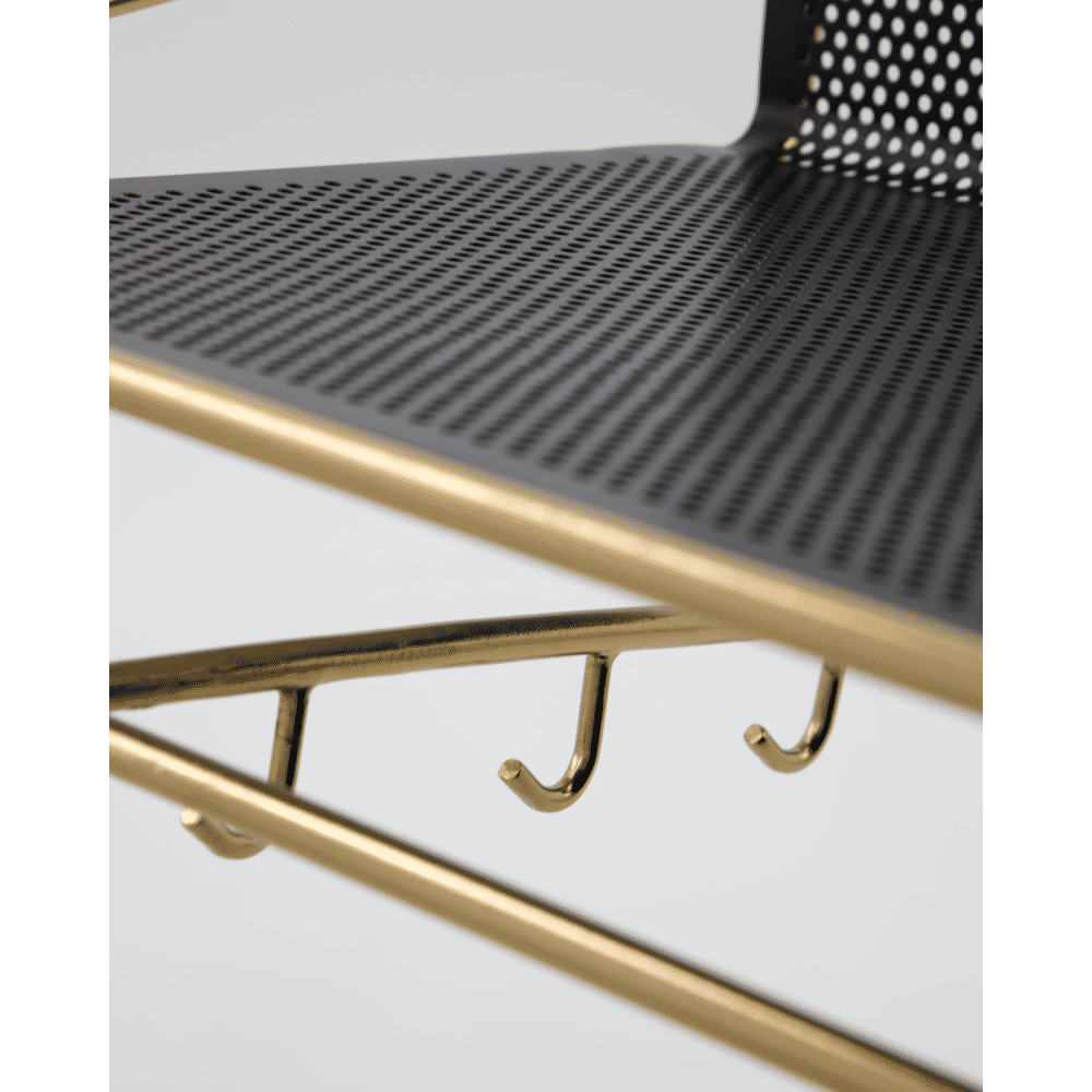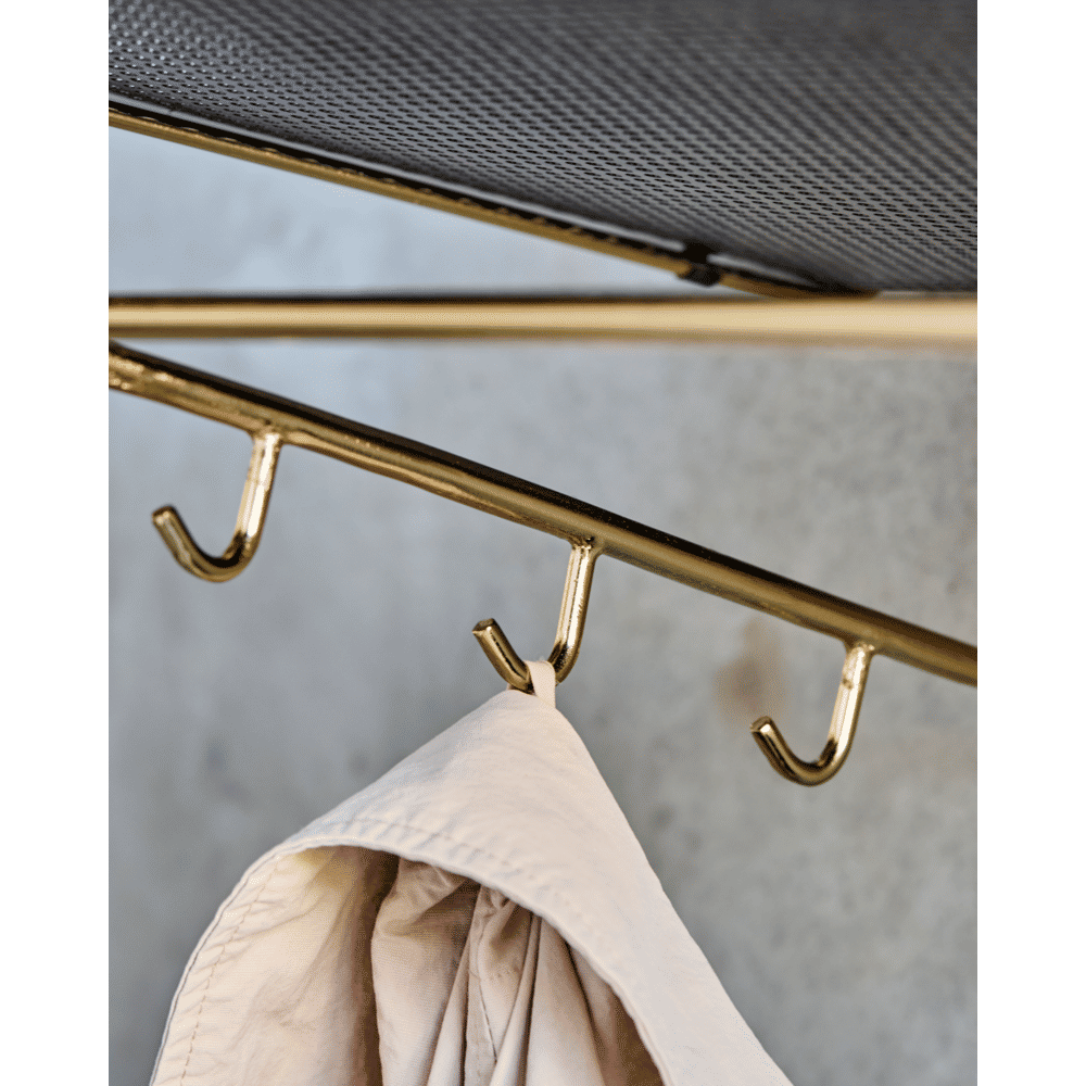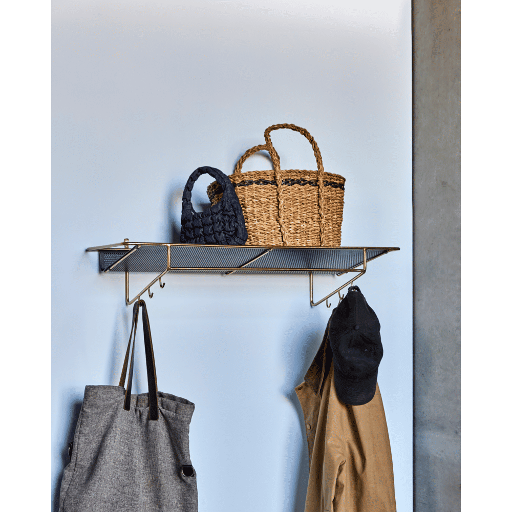 De Wally wandplank van House Doctor combineert stijl en functionaliteit. Het handgemaakte ontwerp is uitgevoerd in zwart geperforeerd metaal met een omlijsting in antiek messing. Dankzij de zes haken en stevige ophangstang biedt dit rek volop ruimte voor jassen, tassen en accessoires.