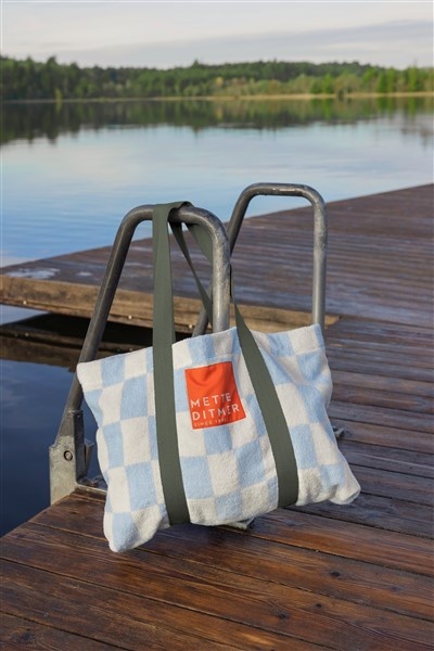 De RETRO strandtas in lichtblauw combineert een frisse kleurstelling met zachte materialen en functioneel design. Het patroon in lichtblauw en offwhite oogt luchtig en modern, terwijl de stevige canvas hengsels in saliegroen zorgen voor een natuurlijke balans.