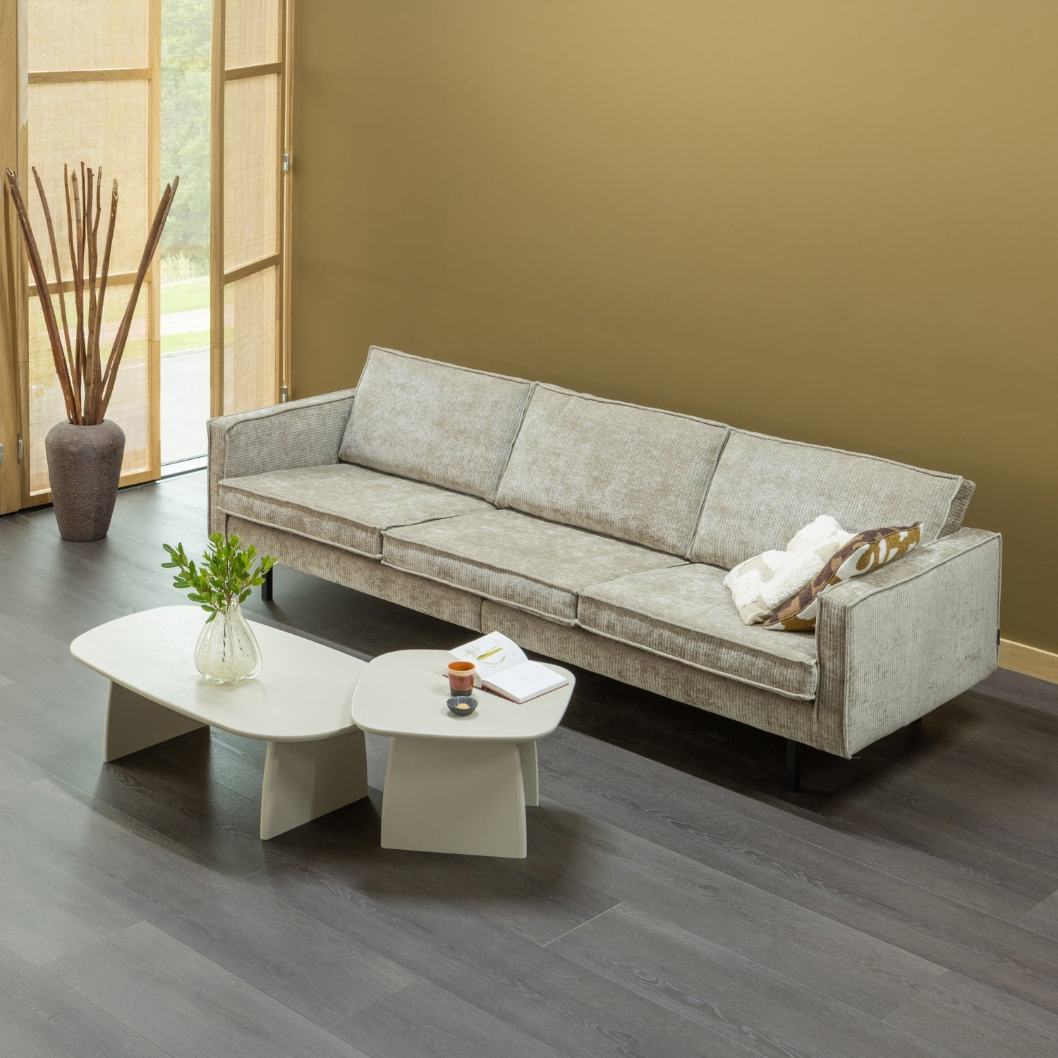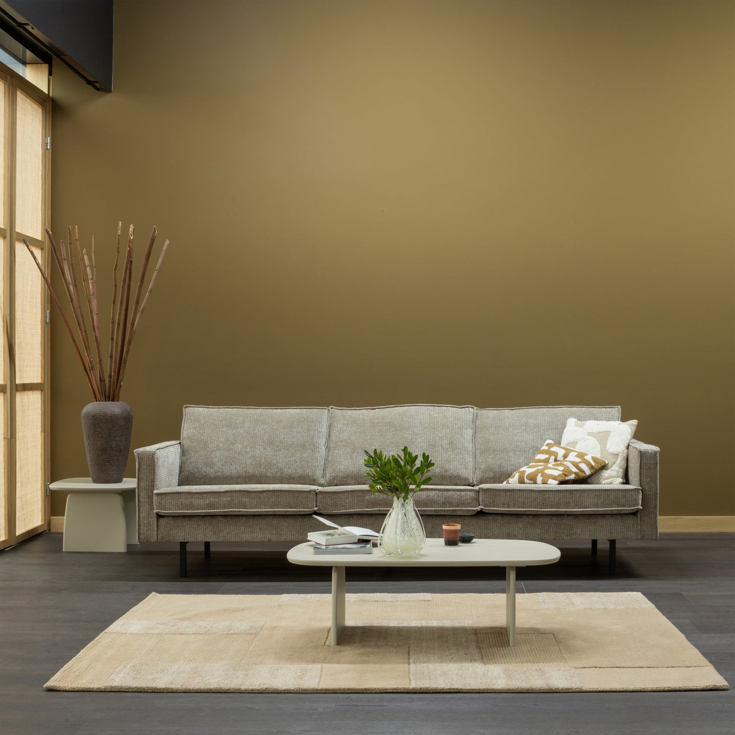 - Modern en eigentijds design - Onderdeel van de bekende Rodeo-serie - Bekleed met luxe ribstof - H 85 cm x B 277 cm x D 86 cm De Rodeo-serie van het Nederlandse interieurlabel WOOOD is modern, stoer en eigentijds. De royale Rodeo's bieden een heerlijk stevig zitcomfort. Dankzij het hoge potenframe ogen de meubelen slank en luchtig. Rodeo staat bekend om de tijdloze kleur- en materiaalcombinaties, geinspireerd op de jaren '50 en vertaald naar een eigentijds design. Ga bijvoorbeeld voor deze luxe ribstof. Dare to be you, dare to go Rodeo! Materiaal De Rodeo bank is opgebouwd uit een combinatie van massief hout, spaanplaat, polyurethaan schuim met een dichtheid van 25 kg/m3 en een zigzag vering. De zitting bevat een polyurethaan schuim met een dichtheid van 30 kg/m3 (T3037). De rugleuning bestaat uit een combinatie van 70% gesneden schuim en 30% siliconen. Deze Rodeo is bekleed met onze trendy Remy rib stof. De Remy Rib is een moderne stof die een luxe uitstraling biedt. Dankzij de bijzondere jacquard weeftechniek heeft de stof een rijke textuur en een fluweelachtig uiterlijk. Onze Ruby Ribstof is gemaakt van 100% polyesterdraad, wat zorgt voor een zachte touch. Met een Martindale score van 80.000 hoef je je geen zorgen te maken over krassen of pillen. Bovendien heeft de ribstof een verstevigde backing en oogt volumineus vanwege de brede banen. Afmetingen - Hoogte: 85 cm - Breedte: 277 cm - Diepte: 86 cm - Zithoogte: 45 cm - Zitbreedte: 253 cm - Zitdiepte: 60 cm - Poothoogte: 20 cm - Hoogte armleuning vanaf vloer: 68 cm - Breedte armleuning: 12 cm - Gewicht: 74 kg - Maximaal draaggewicht: 250 kg wanneer gelijkmatig verdeeld. Onderhoud Zorg dat je bij ribstof altijd vlekken verwijdert met de vleug mee. Deppen met een lichtvochtige, schone doek laat de meeste vlekken eenvoudig verwijderen. Is de vlek hardnekkiger? Laat een vochtige doek de vlek absorberen. Het eventueel naborstelen met een zachte borstel zal ervoor zorgen dat de ribstof heerlijk zacht blijft aanvoelen. Levering De Rodeo 3-zits bank wordt in twee pakketten geleverd. De poten zijn eenvoudig te bevestigen aan de hand van de bijgeleverde montagehandleiding. Plaats voor het beschermen van harde vloeren viltglijders aan de onderzijde van de poten.