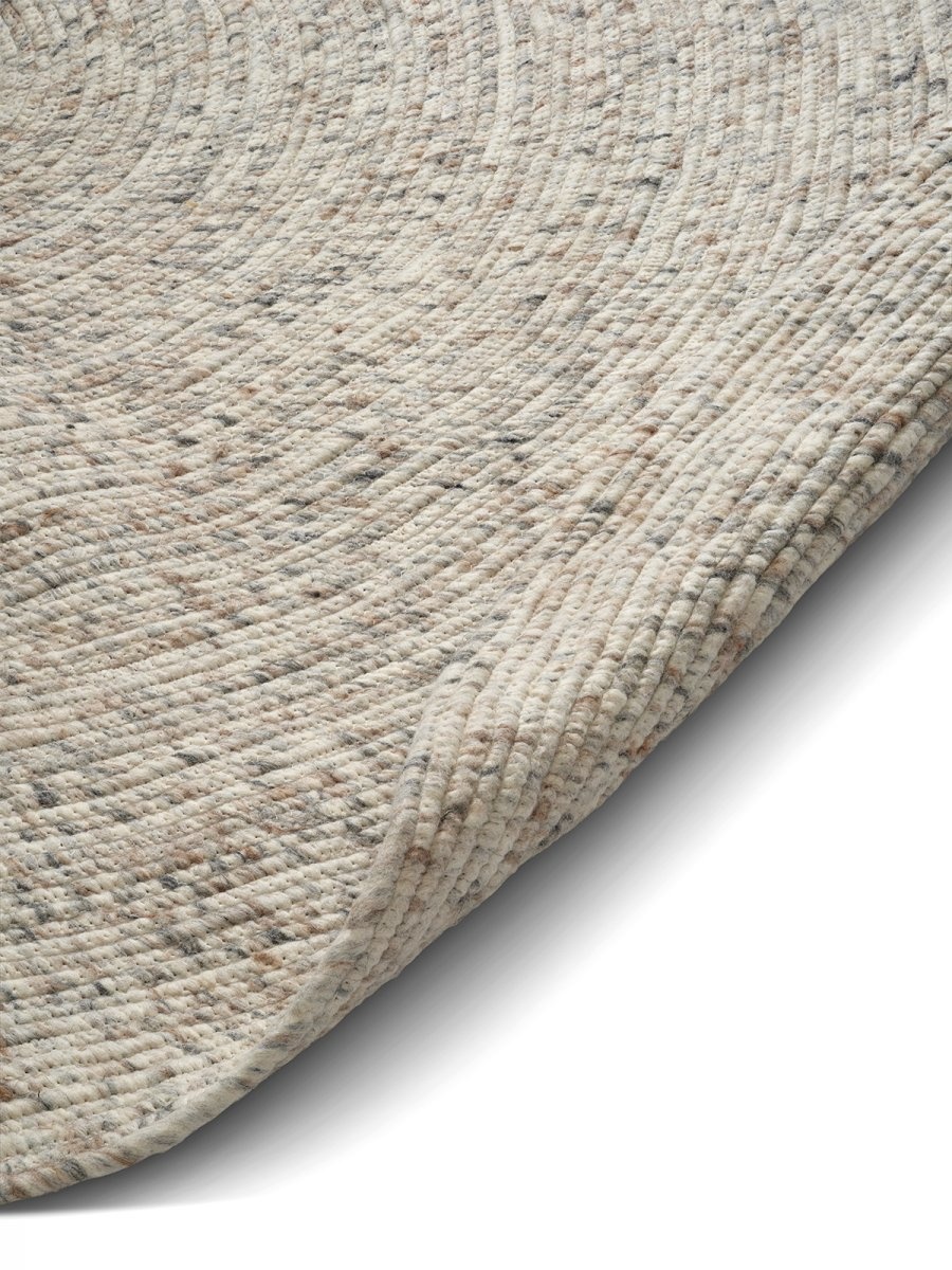 Round rug Merino wool in the color natural beige. A tasteful and timeless rug with elements of all the beautiful colors of wool in a wonderful mix. This color contains both warm tones in white / beige and brown and also cold tones in gray. A rug and color that fits everywhere.The wool is naturally oily and therefore resists dirt and stains in an effective way. The carpet is also reversible and can advantageously be turned over after a period of use.