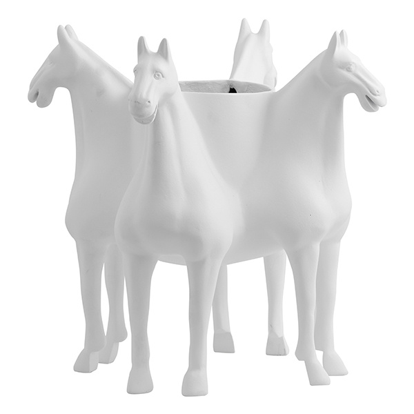 ROXA vaas met een artistiek ontwerp. Een vaas die niet alleen een vaas is, maar ook een decoratief middelpunt, dat zeker de aandacht trekt in elk interieur. Een volumineuze vaas bestaande uit vier paarden samengevoegd tot één groot beeld. Hier wordt functionaliteit gecombineerd met esthetiek, wat resulteert in een modern, stijlvol middelpunt. ROXA is een uniek, op zichzelf staand kunstwerk dat drama en persoonlijkheid aan je huis toevoegt. De vaas is gemaakt van glasvezel, wat een sterk materiaal is. Reinigen met een zachte doek en mild zeepwater.