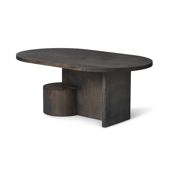 Het ovale blad speelt met meerdere vormen en rust licht op twee geometrische verbindingen die zijn verankerd door een zware, cilindrische basis.