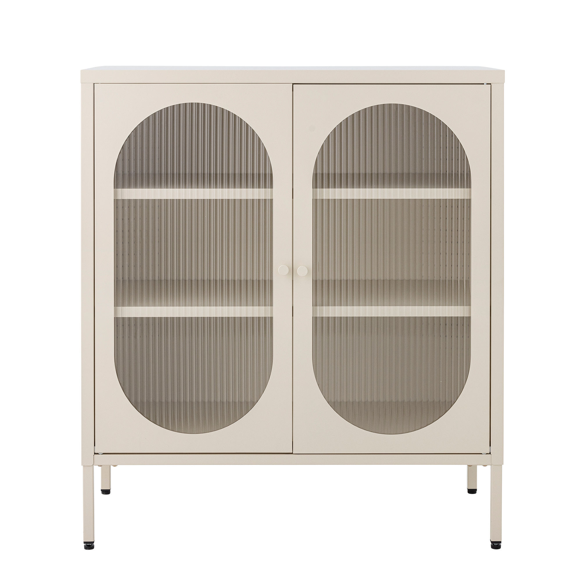 The Salvo Cabinet by Bloomingville is a beautiful metal cabinet in a soft sand color that adds elegance to any room. The cabinet's two doors feature decorative details in ribbed glass. With its practical shelves, this cabinet is ideal for both storage and display, fitting perfectly in the living room, dining room, or entryway.