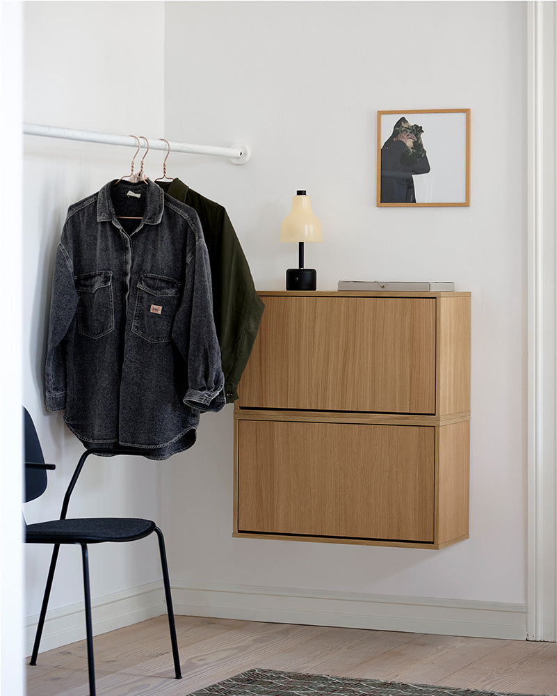 ReCollector Shoe Boxes – Create Your Own Storage Wall with StyleOur shoe boxes are the perfect solution for organizing your shoes in a stylish and efficient way. Available in five different versions – five beautiful colors and an oak veneer – each box can hold 6–8 pairs of shoes, giving you plenty of space for sneakers, boots, and elegant shoes.The shoe box is ideal for an inviting entrance, a well-organized wardrobe, or a utility room with structure and order. Its simple and classic design allows the box to blend seamlessly with your personal décor, while adding natural elegance, order, and functionality to your home.The box is wall-mounted, meaning it won’t take up floor space and ensures easy cleaning. You can stack the boxes on top of each other, place them side by side, or arrange them in any way that suits your style and home. Combine them with our other storage boxes, which share the same design and color universe, and create a personalized storage wall that reflects your taste.The shoe box opens easily with a push-lock, so you can quickly access your shoes when you need them. It is assembled and designed to last for years, ensuring your shoes are well-protected. You can also use the top surface for additional storage or decorative items.Our shoe boxes are produced in Denmark from FSC-certified wood.In short, ReCollector’s shoe box is the perfect way to organize your shoes in a practical and simple way, while adding a beautiful and elegant detail to your home.Materials and DimensionsFSC-certified woodWidth: 70 cmHeight: 40 cmDepth: 30 cmWeight: 12.5 kgColor gloss: 30Note: We have chosen to flatpack our shoe box to optimize transportation and reduce the risk of transport damage, which ultimately lowers our CO2 footprint. Therefore, the box is delivered unassembled, but with our detailed guide, it is easy and straightforward to assemble and mount.MaintenanceThe Shoe Box can be cleaned with a soft, damp cloth or sponge. If necessary, you can add a mild dish soap or regular soap. Wipe with a clean, dry cloth.Let me know if you need any further adjustments!