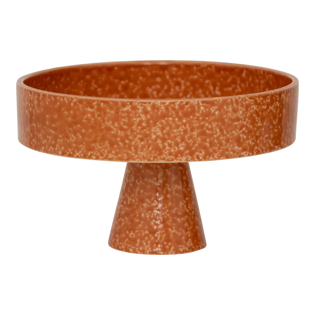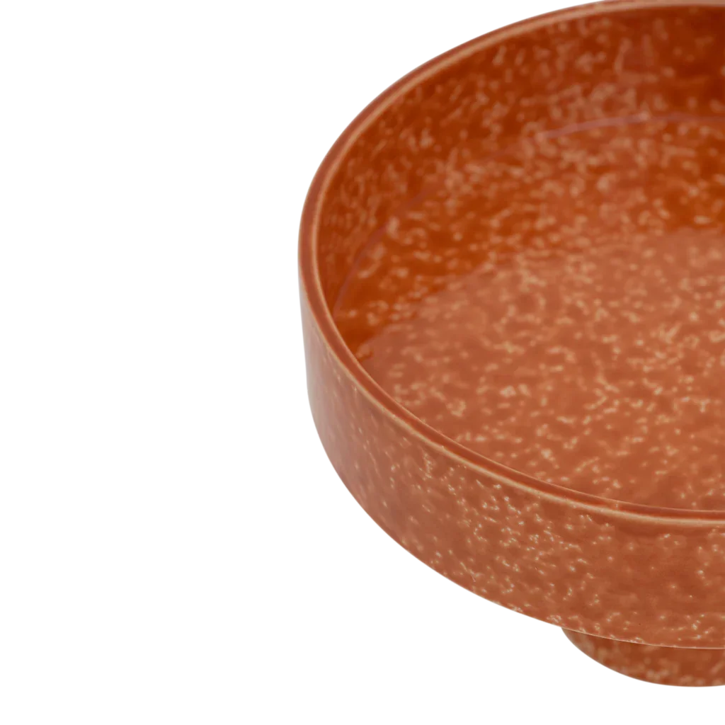 Een serveerschaal in deep orange met een reactieve glazuurlaag is ideaal als een echte blikvanger op tafel, gemaakt van 50% gerecycled keramiek en 50% nieuw keramiek— perfect als fruitschaal of serveerplateau.