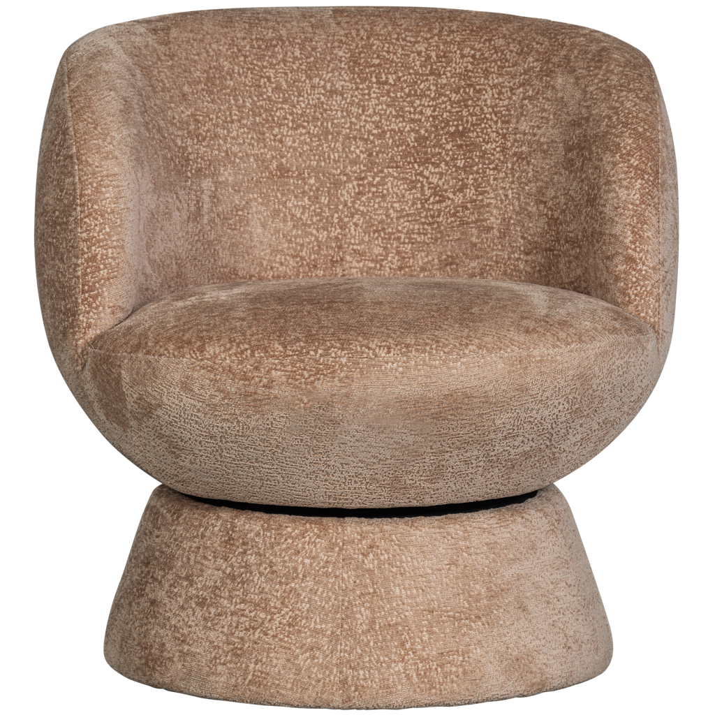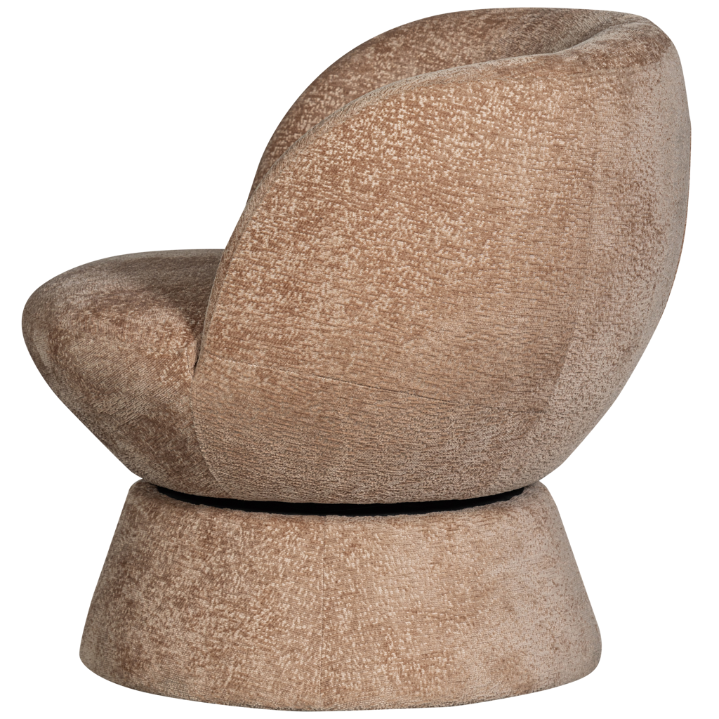 De Shuffle draaifauteuil komt uit de collectie van het Nederlandse merk BePureHome en heeft een vriendelijke, zachte uitstraling. De zitting en voet vormen een zandloperfiguur en zijn van top tot teen bekleed met een grof geweven stof met luxueuze lichtweerkaatsing.