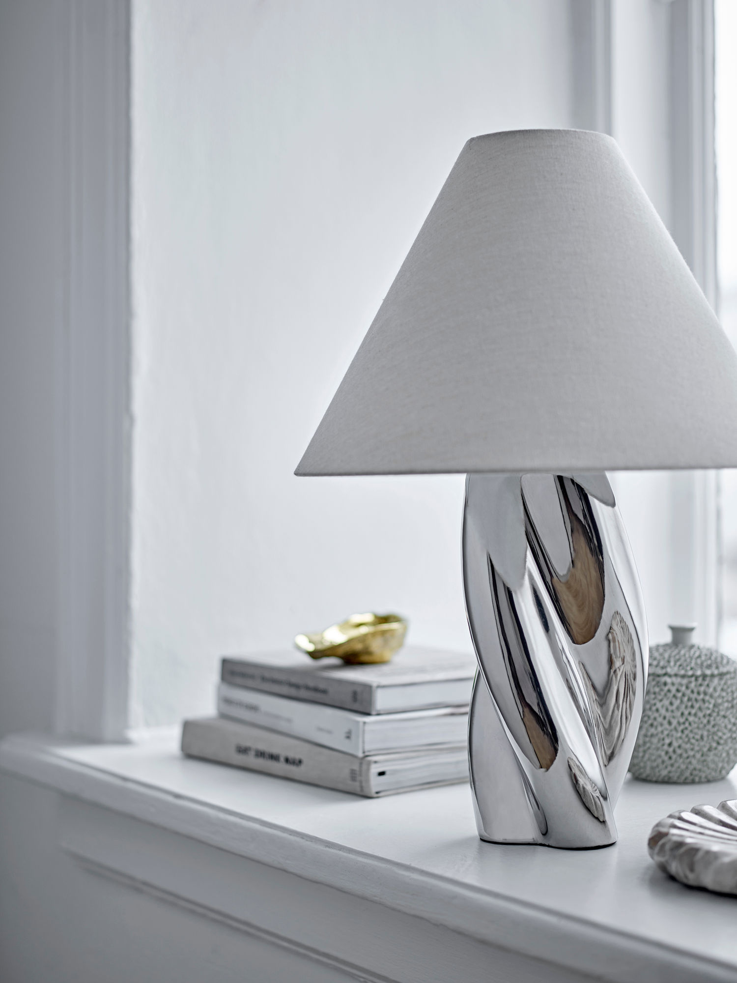De Silva tafellamp van Bloomingville combineert een sculpturale keramieken voet in zilverkleur met een klassieke linnen kap. Het resultaat is een elegante, moderne lamp die net dat beetje extra luxe toevoegt aan je interieur. Mooi op een dressoir, nachtkastje of side table als sfeervolle verlichting.