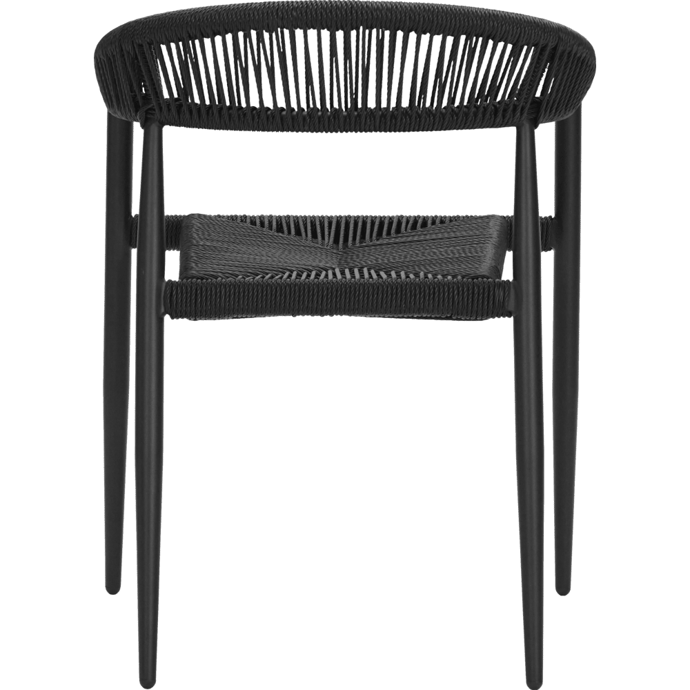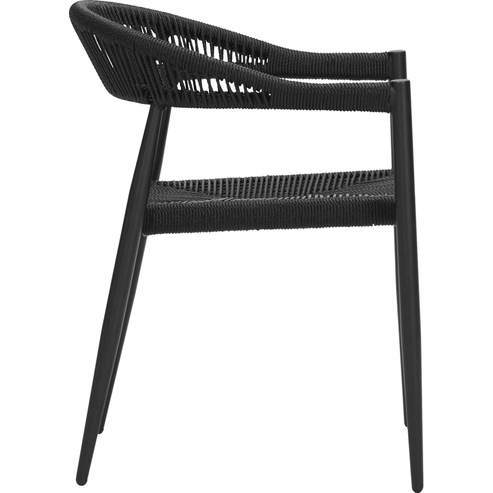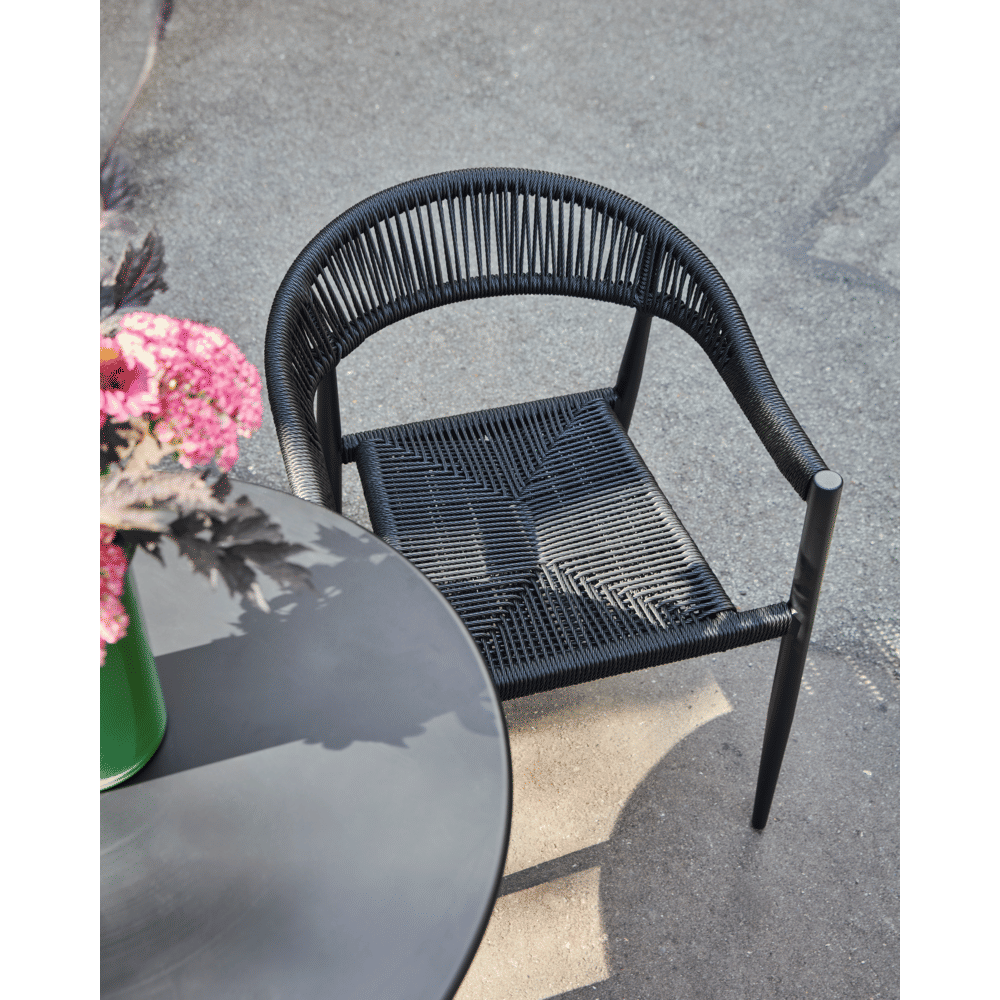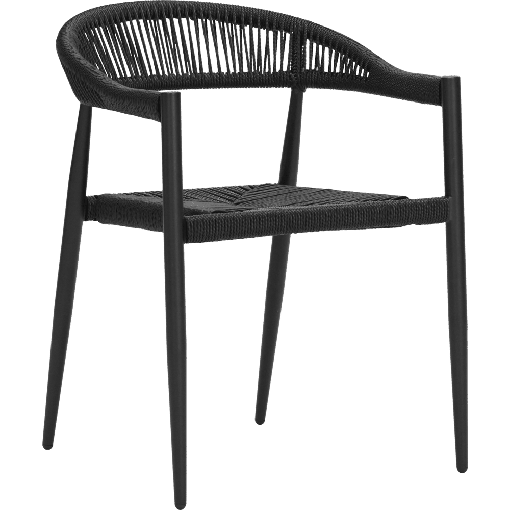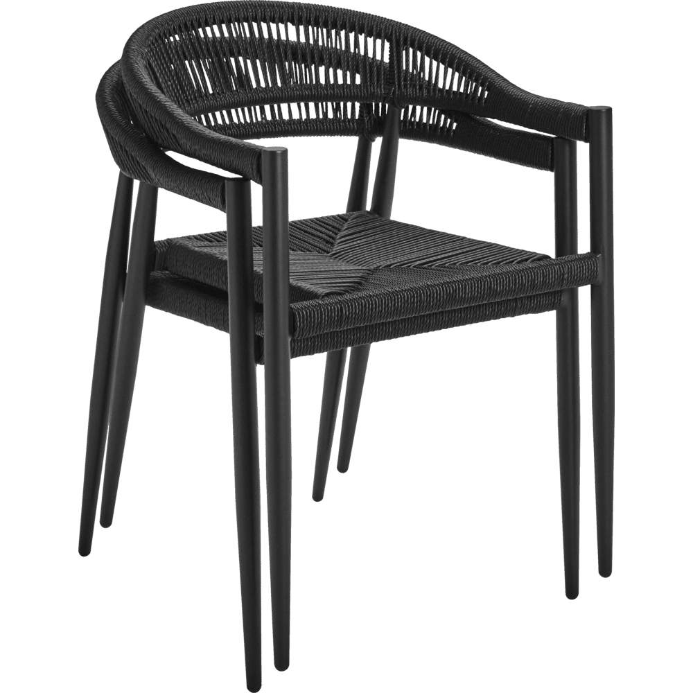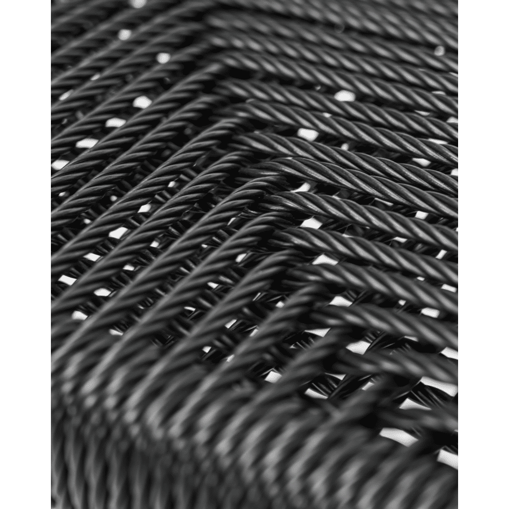 De Coon stoel combineert een slank aluminium frame met een gedetailleerd vlechtwerk van synthetisch rotan. Het volledig zwarte design verenigt lichtheid en kracht met een verfijnde, textuurrijke uitstraling.