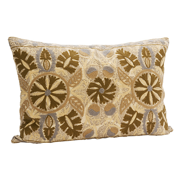 Met deze Suzani geborduurde kussenhoes van Madam Stoltz creëer je een rustige, gelaagde uitstraling. Ivoor, dusty blauw, kaki en grijsbeige vormen samen een zacht kleurenpalet dat perfect aansluit bij een Scandinavisch interieur.