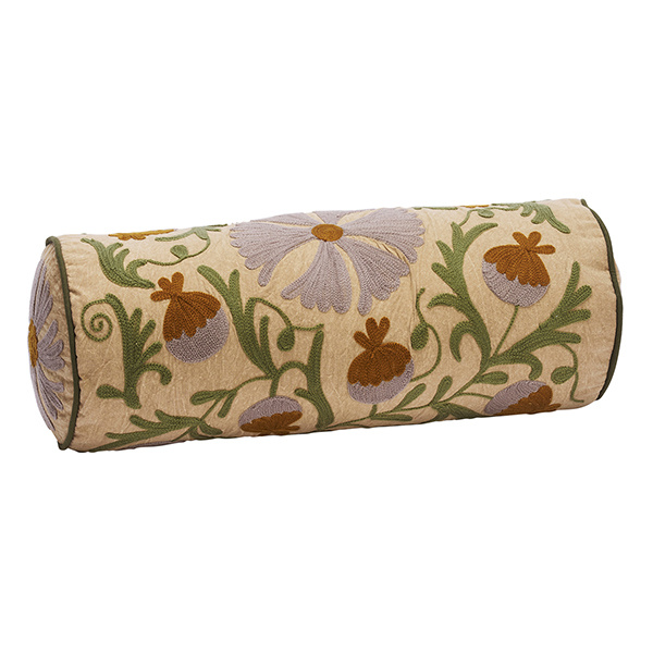 Deze prachtige kussenrol van Madam Stoltz is een eerbetoon aan eeuwenoude borduurkunst. De oudroze, steen-, pompoen- en groentinten zorgen voor een warme en rijke uitstraling, perfect voor interieurs met een bohemien of eclectische twist.