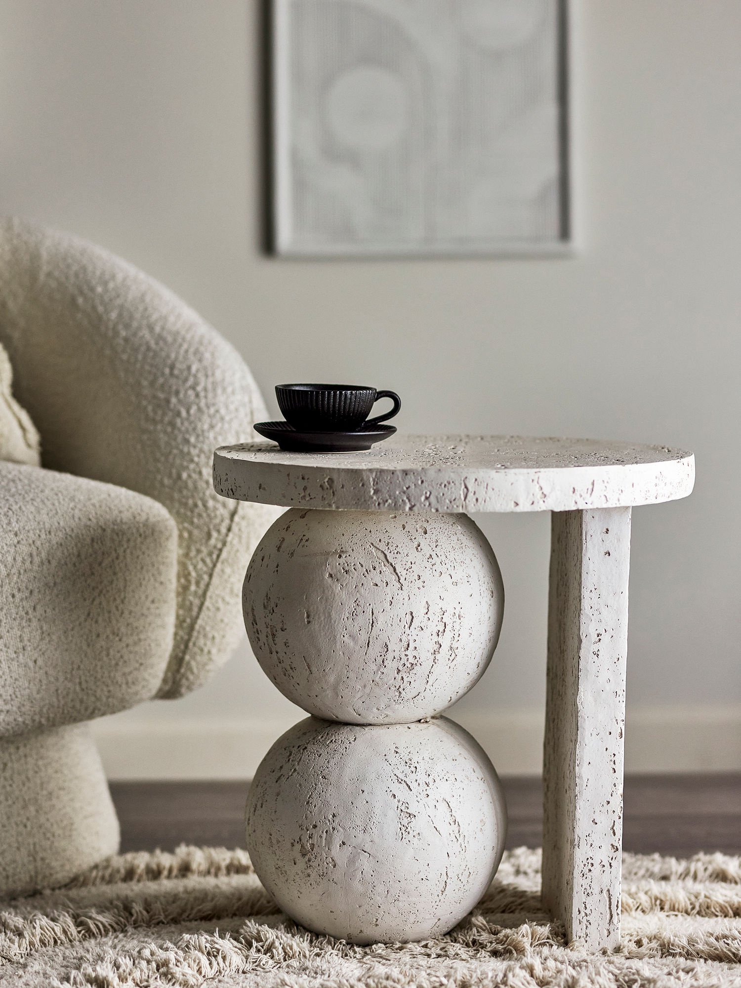 De Tally bijzettafel van Bloomingville is een opvallende tafel van hars met een oliegeverfde afwerking. De vorm bestaat uit twee gestapelde bollen in een zachte witte kleur die lijkt op travertijnsteen. Ideaal als bijzettafel of decoratief object in moderne interieurs.