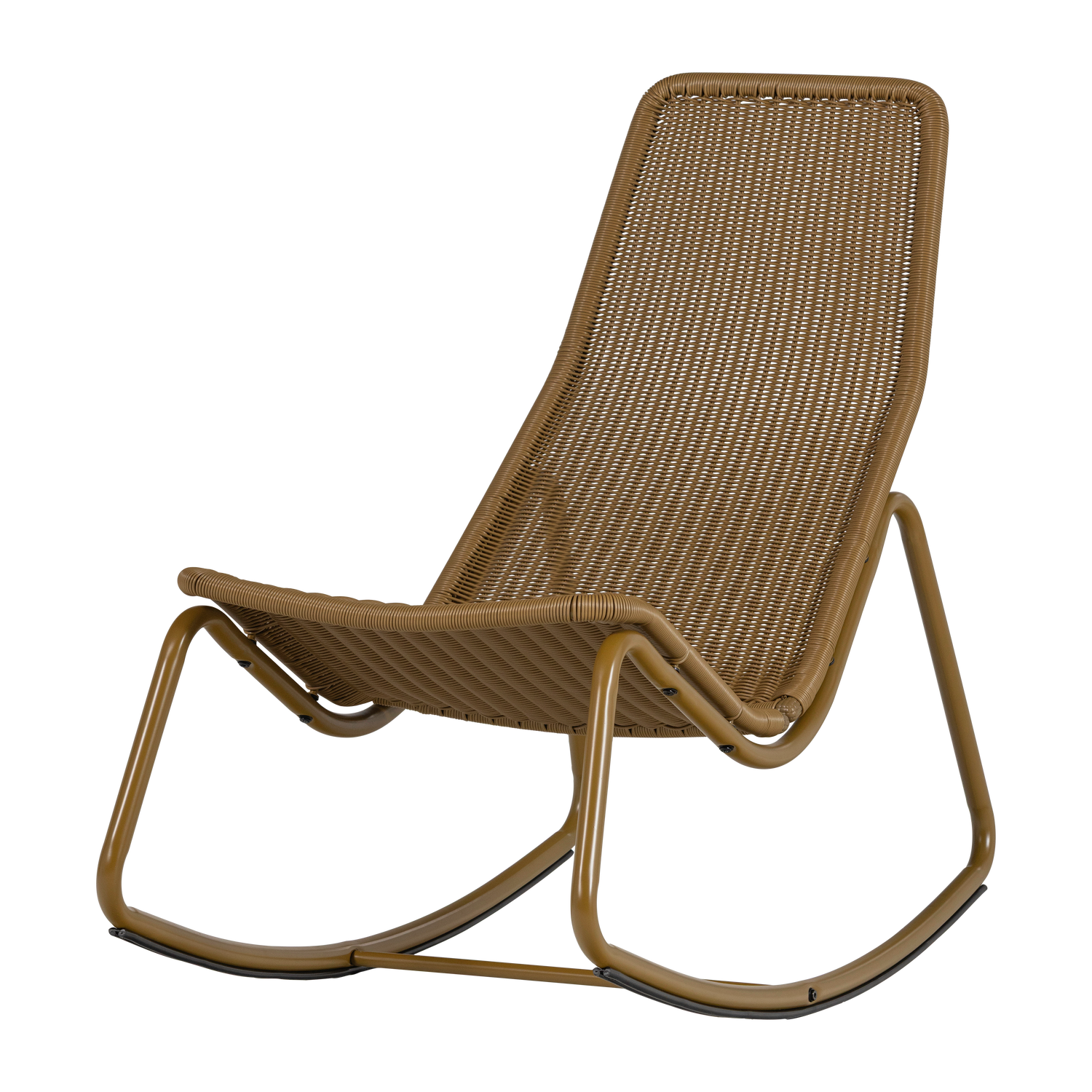 De Tom schommelstoel is een relaxte stoel voor binnen en buiten. Tom komt uit de collectie van het Nederlandse merk WOOOD en is gemaakt van kunststof rotan met een honinggele coating. Tom is geschikt voor binnen- en buitengebruik doordat er een beschermende coating over de stoel heen zit. Hierdoor is het materiaal geschikt voor alle weersomstandigheden. Het honinggele metalen frame heeft een matte uitstraling en een verstevigende tussenlat.